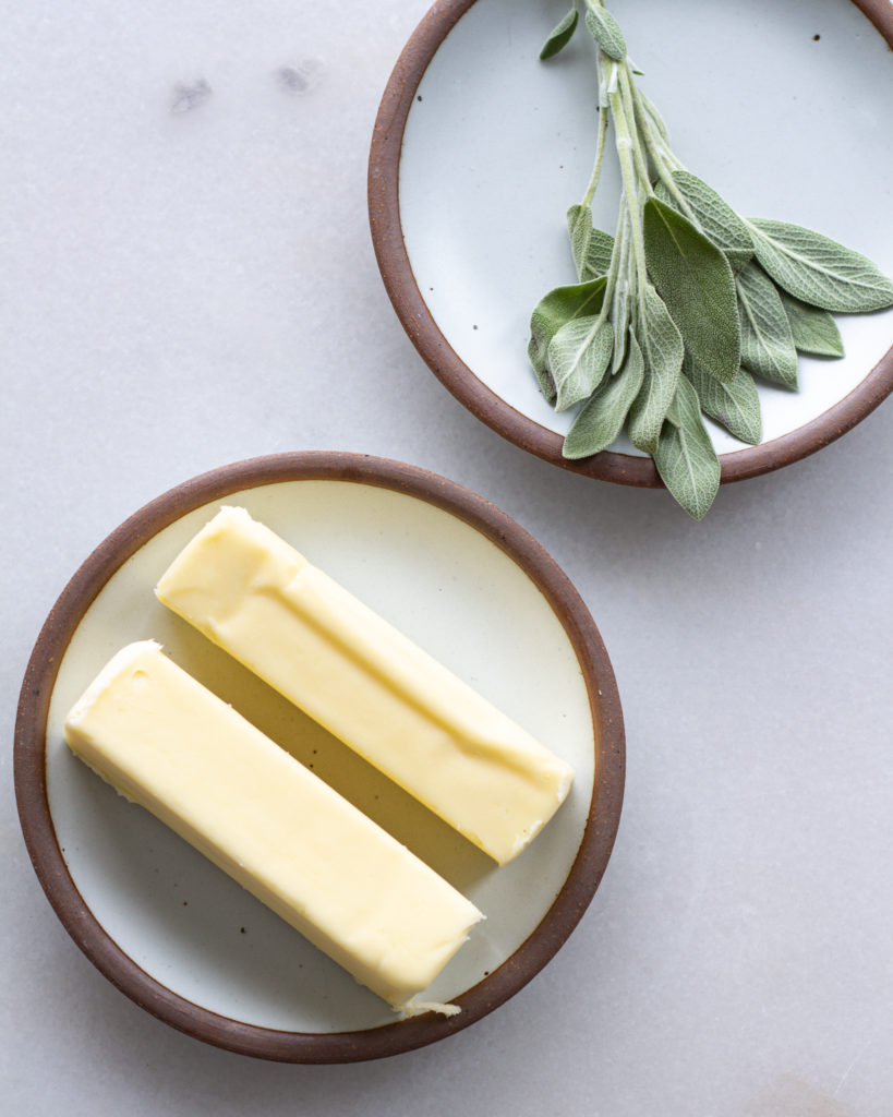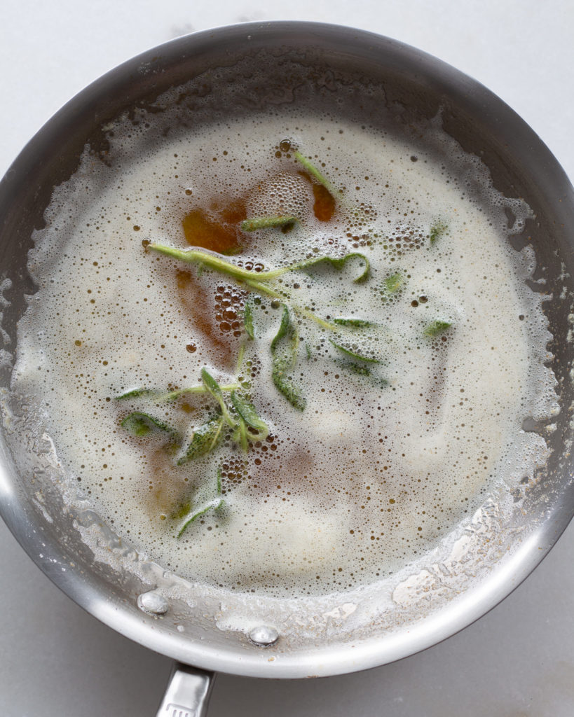 - Add the butter to a pan on medium heat. Work low and slow to let the butter melt, come to a slight fizz, and then brown slightly. This will take about 4-5 minutes. When you see the milk solids separate and start to brown at the bottom of the pan, turn off the heat and add the sage. The sage will sizzle for a few minutes, let is infuse into the butter and then remove the sage leaves. Transfer the browned butter to a bowl.