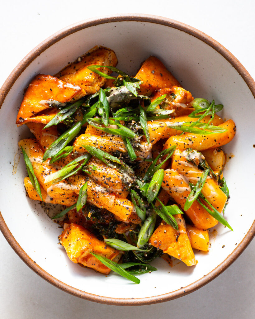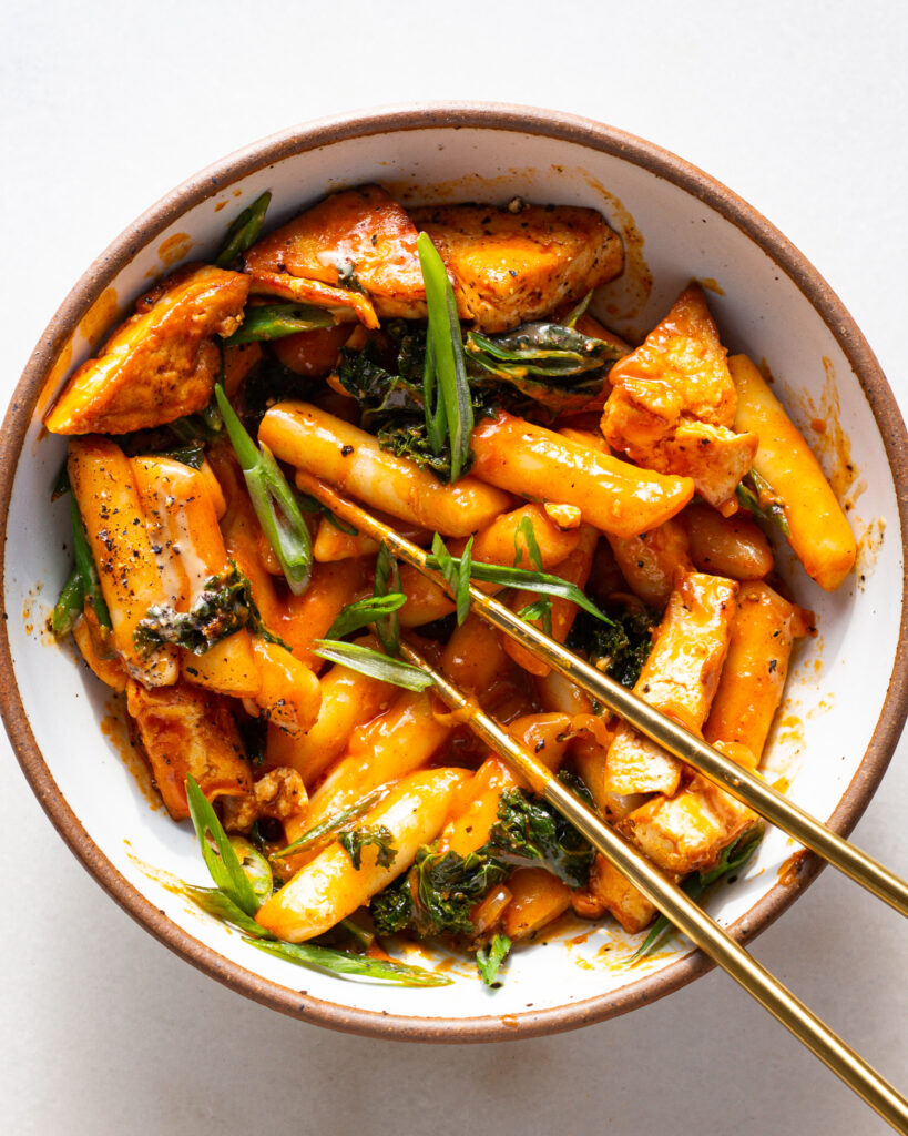 If you aren’t familiar with tteokbokki, it is a Korean steamed rice cake, and it is everything delicious that a carb can be. It’s chewy, delicious, easy to prepare, and when you coat it in a glossy, spicy, buttery sauce, it is heaven on a plate. This is not traditional tteokbokki, but it is one of my favorite quick meals to whip up in a pinch. It’s also one of my favorite ways to treat myself, whether it’s for a quick weeknight meal or for a cozy weekend dinner. I’ll detail more about traditional tteokbokki below, as well as share how to make this rich, glossy tofu and brown butter tteokbokki.