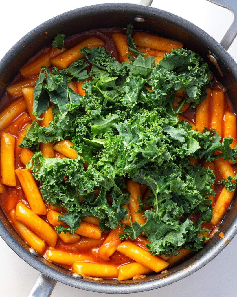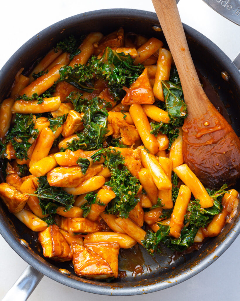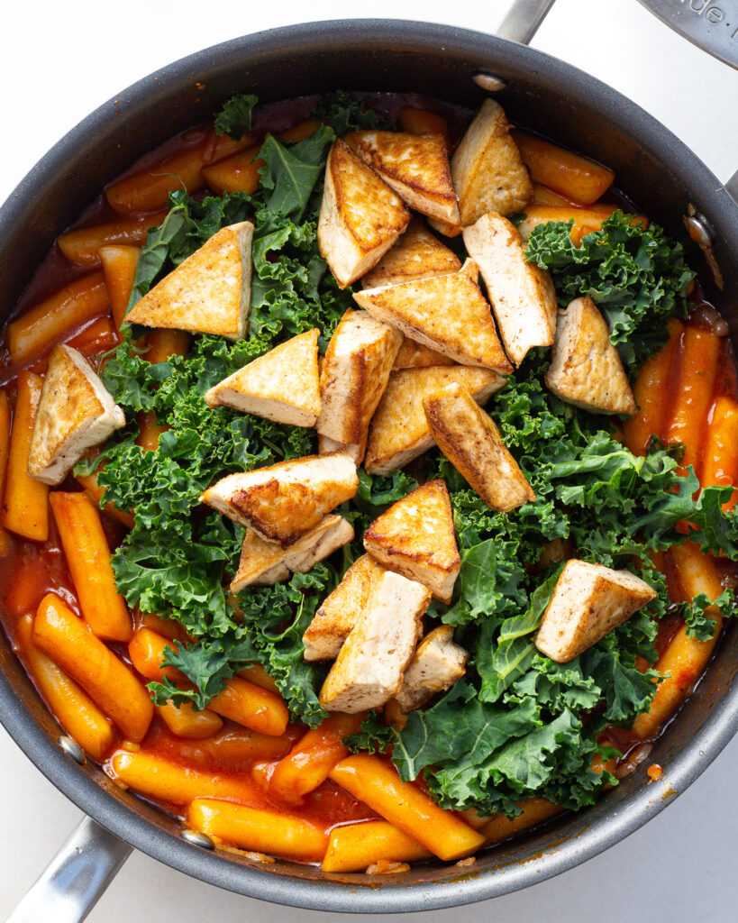 - When the sauce becomes thick and glossy, add 2 cups of shredded kale and mix to let it wilt into the tteok. Add in the tofu and stir so it gets coated in the sauce. Remove the pan from the heat.