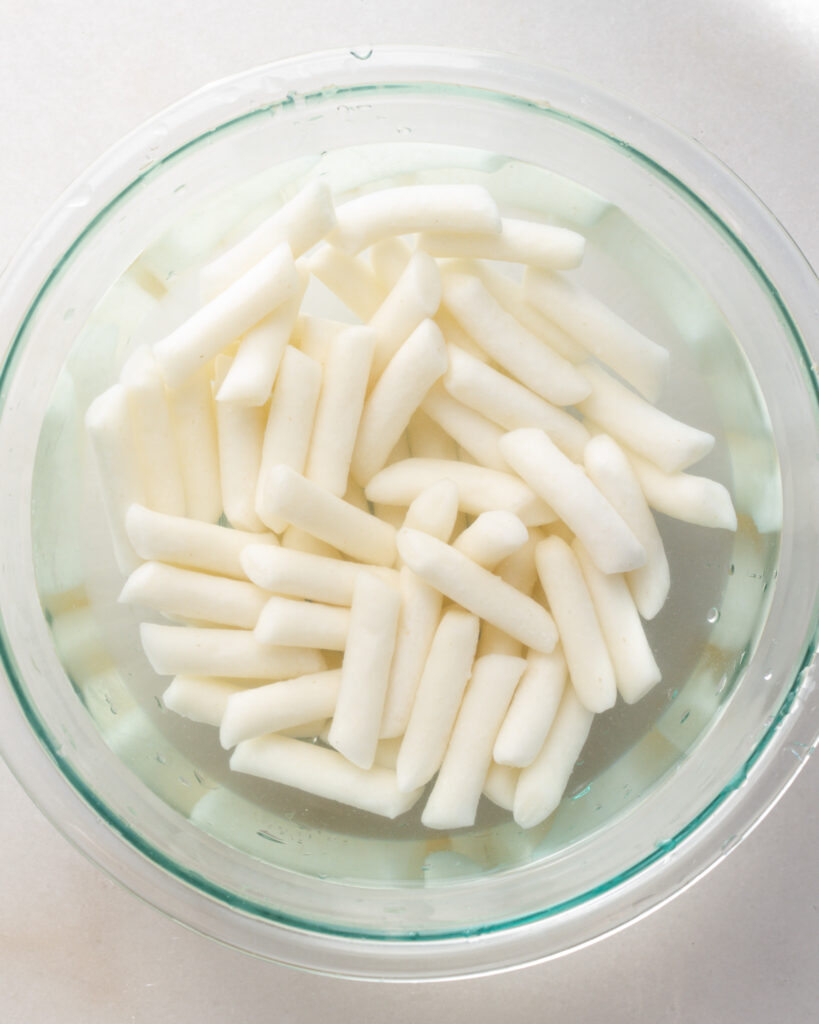 - Rinse the rice cakes well. Add them to a large bowl and cover with water. Let them sit while you prep the rest of the ingredients.