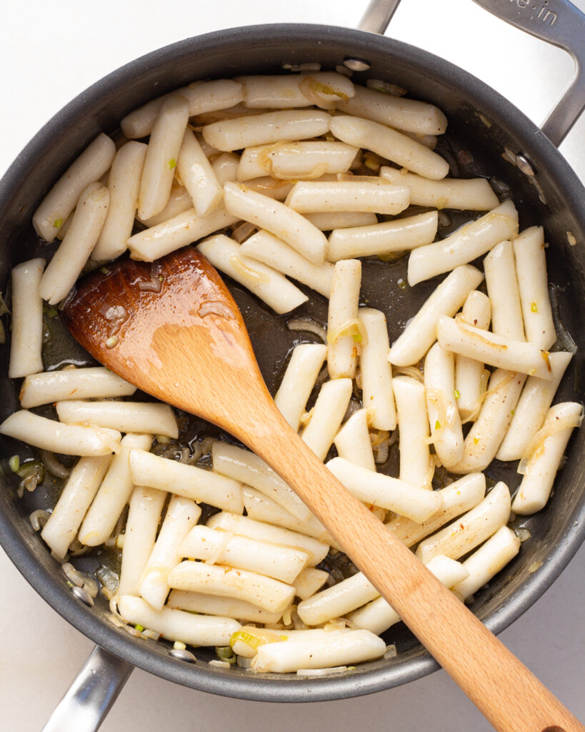 - Transfer the rice cakes from the water they are soaking in straight into the sauté pan. Cook for 1-2 minutes to let them get coated in the flecks of brown butter.