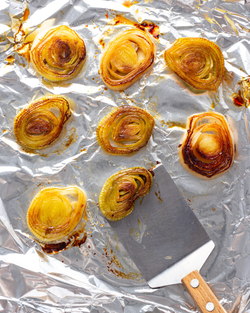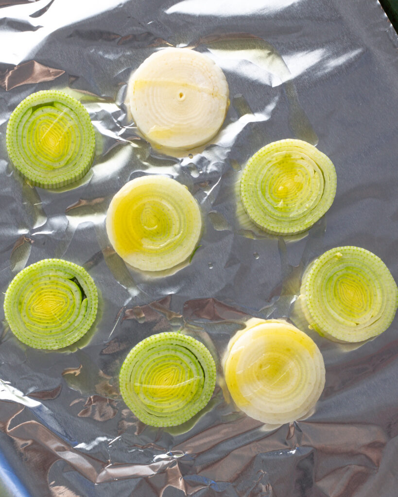 - We are cooking the leek bottoms within aluminum foil, giving them the opportunity to caramelize and get soft and jammy.