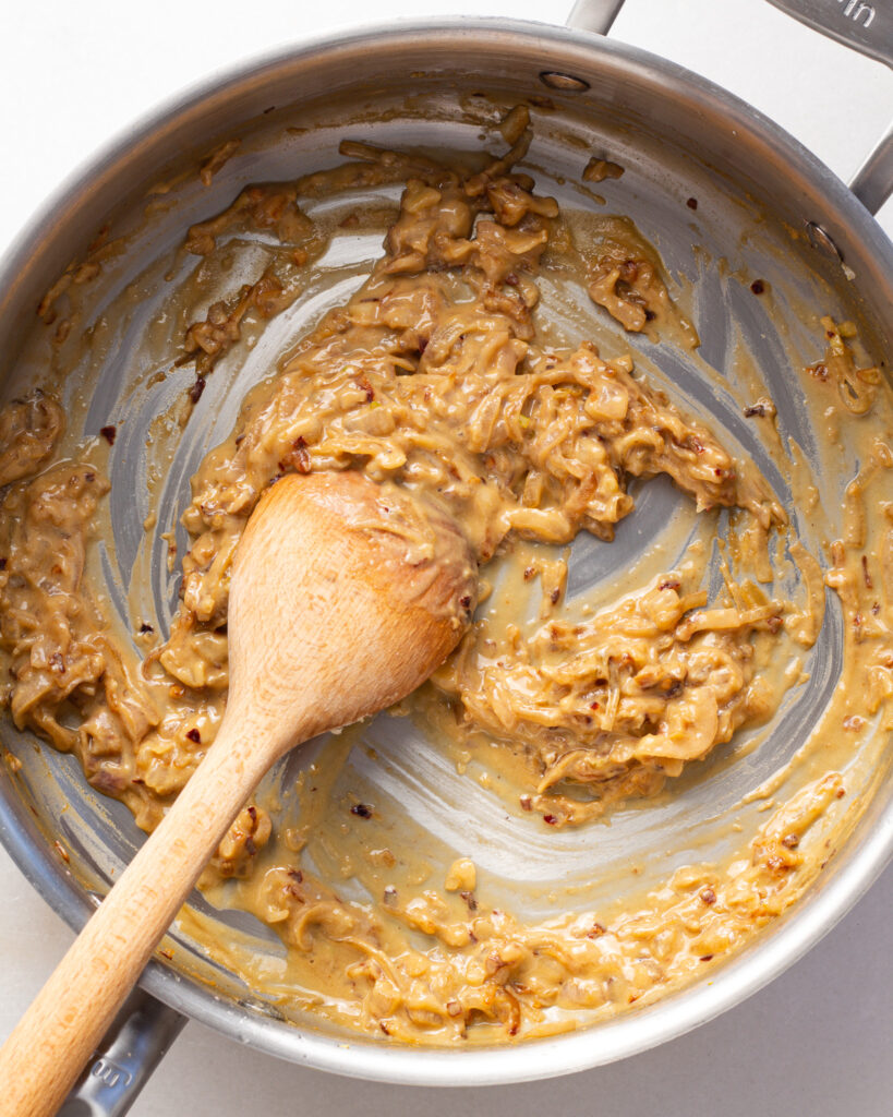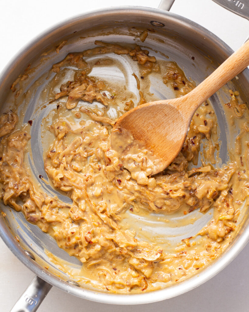 - The shallots are slowly caramelized, making a rich, easy sauce that we can build off of with the other few ingredients.