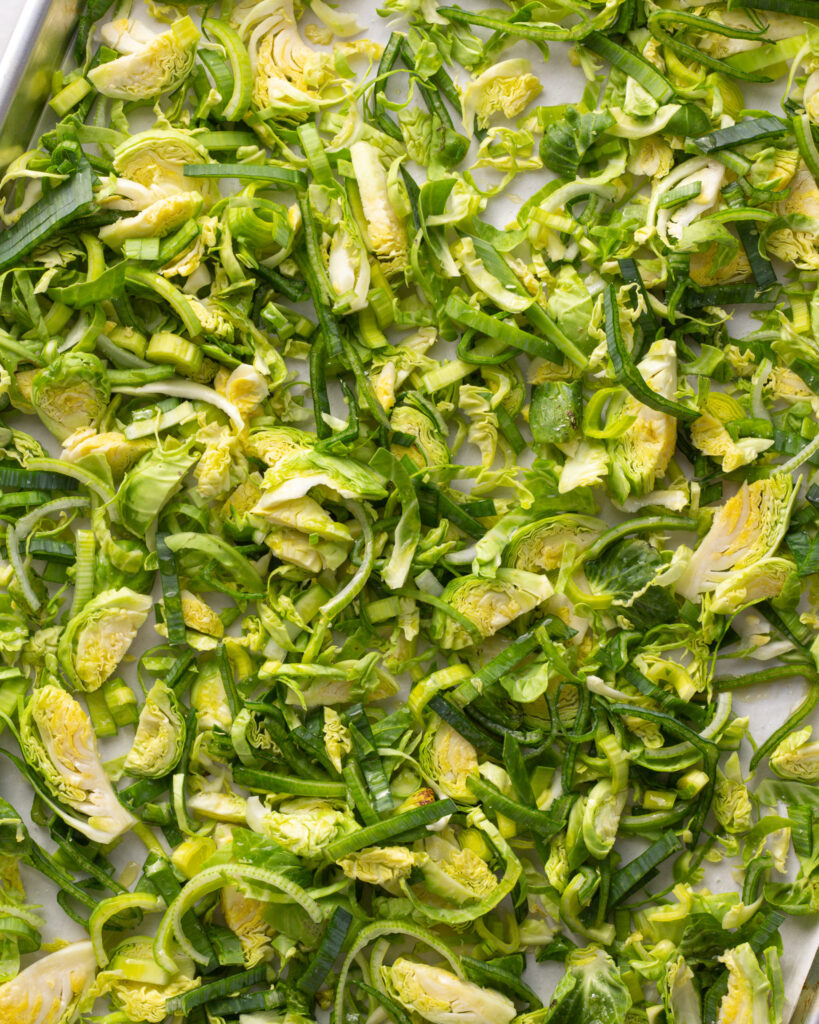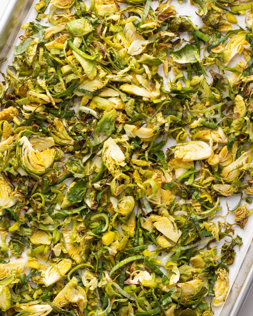 - Line one sheet pan with foil and the other with parchment paper. Spread the leek greens and brussels sprouts on the parchment paper side. Spread the leek circles on the foil. Drizzle both with olive oil and season with salt. Fold the aluminum foil over the top of the leek circles to encase them, and then stack the baking sheet with the greens on top. This is to get the leeks on the bottom pan rich and jammy, and the greens on top nice and crispy. Roast for 20-25 minutes at 400°F.