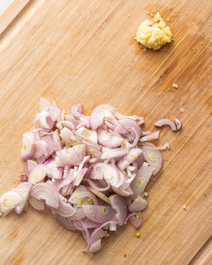- Thinly slice the shallots & grate the garlic. Add a generous glug of olive oil to a sauté pan and put it on medium heat. Add the shallots and cook for a good 15-16 minutes, or until they start to char and darken. Add in the garlic and red pepper flakes and cook another 1-2 minutes.