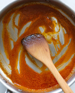 - While that is roasting, place a small saucepan over medium-low heat and melt the butter. Add in the hot sauce, garlic powder, paprika, vinegar and cook for a 2-3 minutes, or until a smooth buffalo sauce forms.
