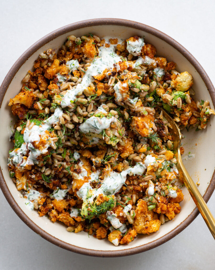 When the cauliflower is out of the oven, toss everything into a bowl. I like to start with the farro salad, then add the buffalo cauliflower, and drizzle on a healthy amount of the dressing. It’s a messy bowl, but absolutely worth every bite.