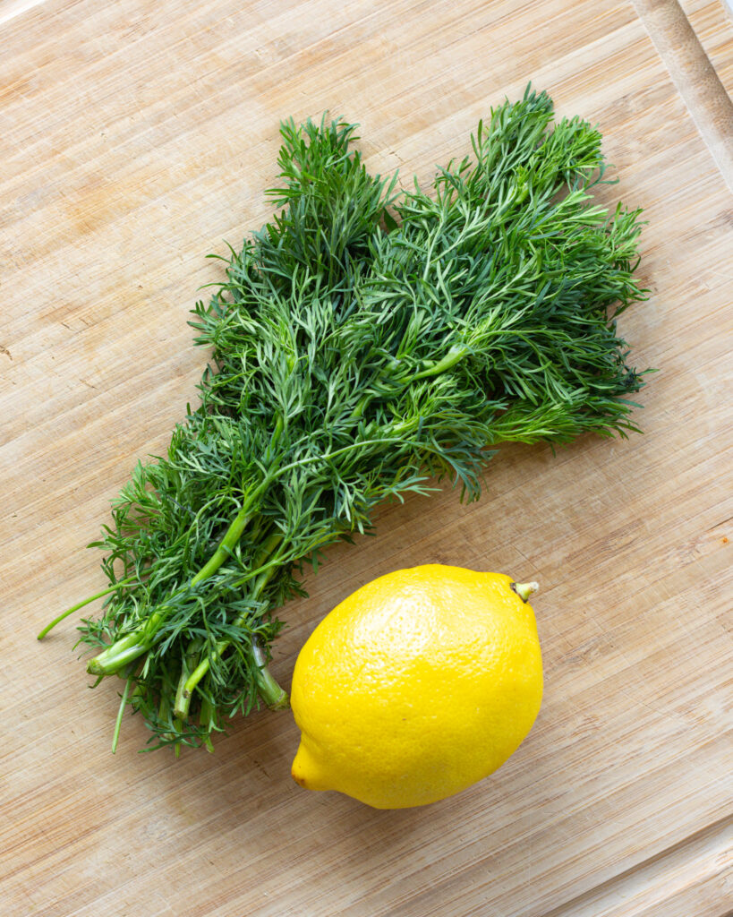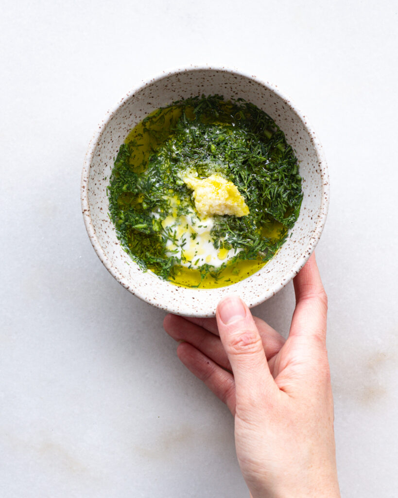 - In another small bowl, add the rest of the chopped dill, the juice from the lemon, the yogurt, garlic, and olive oil. Mix to create a dressing and season with kosher salt and freshly ground black pepper as preferred.