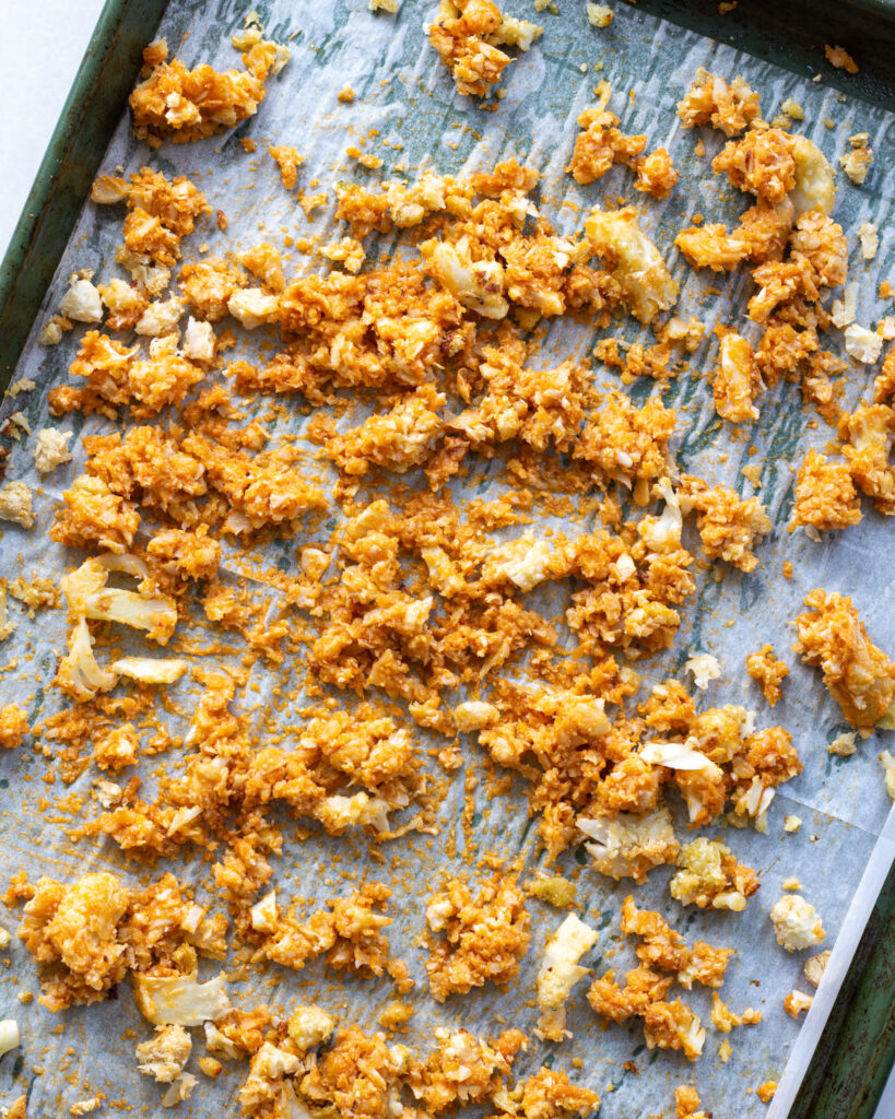 To do this, roughly chop up the cauliflower florets. In a small food processor, add 1/2 of the cauliflower and 1/2 of the chickpeas. Pulse until the chickpeas are in small pieces and the cauliflower is in chunks. Spread this batch out on a parchment-lined baking sheet. Repeat with the remaining chickpeas and cauliflower and spread those out on a separate baking sheet.