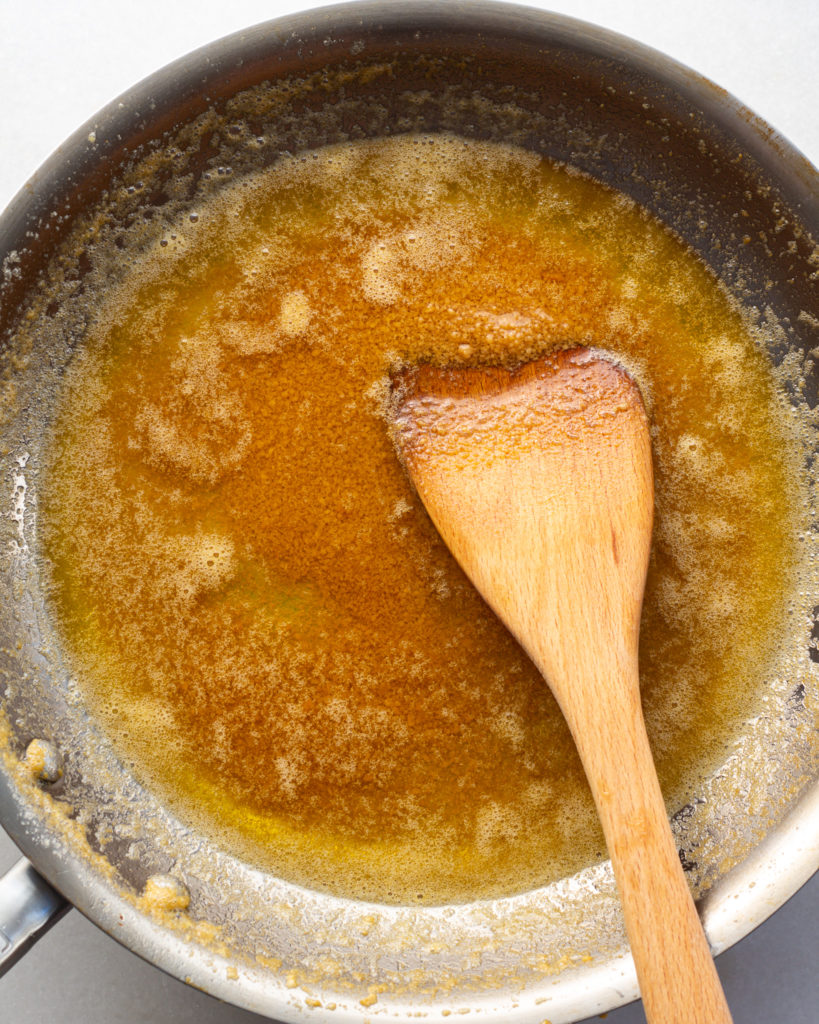 To brown the butter, it’s best to put a skillet on medium-low heat, and melt the butter until it is golden yellow. Add in the miso and stir with a spatula until it is fully combined and no clumps remain.