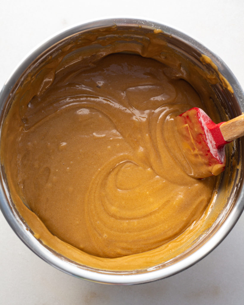 You need to let the brown butter completely cool before adding in the eggs and sugar, this is so the eggs don’t curdle and the sugar doesn’t, essentially, melt into the batter.