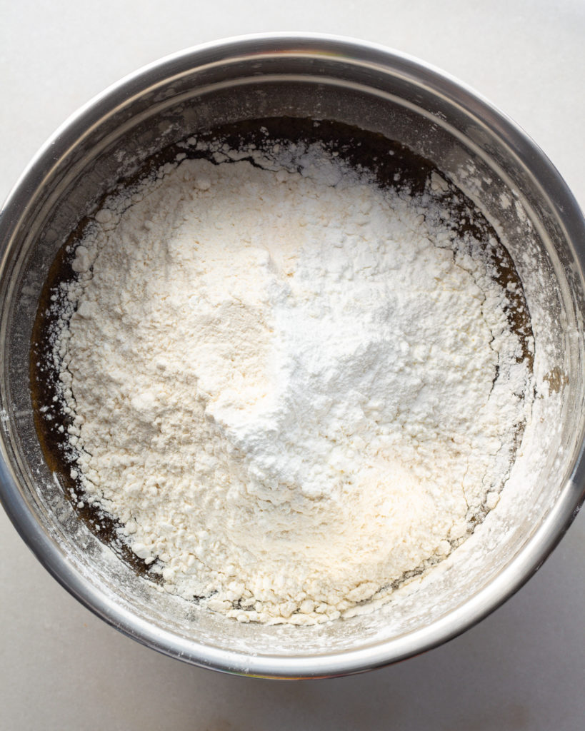 - If the bowl is large enough, add in the flour, cornstarch, baking powder and whisk to combine. The dough should be sticky and a little wet feeling, but it will thicken up.