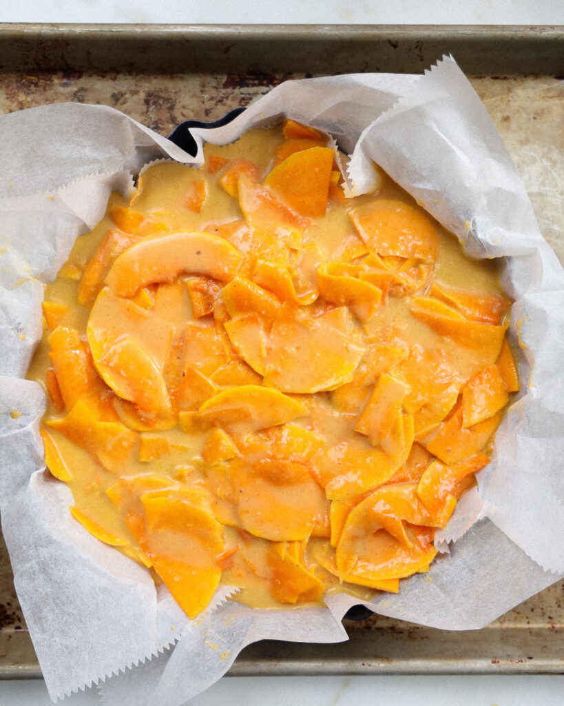 - Scoop the squash out of the bowl, shaking off any excess custard, and layer it into the pan. It doesn’t need to be perfect, but you want the squash pieces to be able to bake into nice layers. When all the squash is in the tart, pour any remaining custard batter over the top. You can reserve some squash slices to make a pattern on the top, but I like the rustic look of letting the squash be naturally arranged.