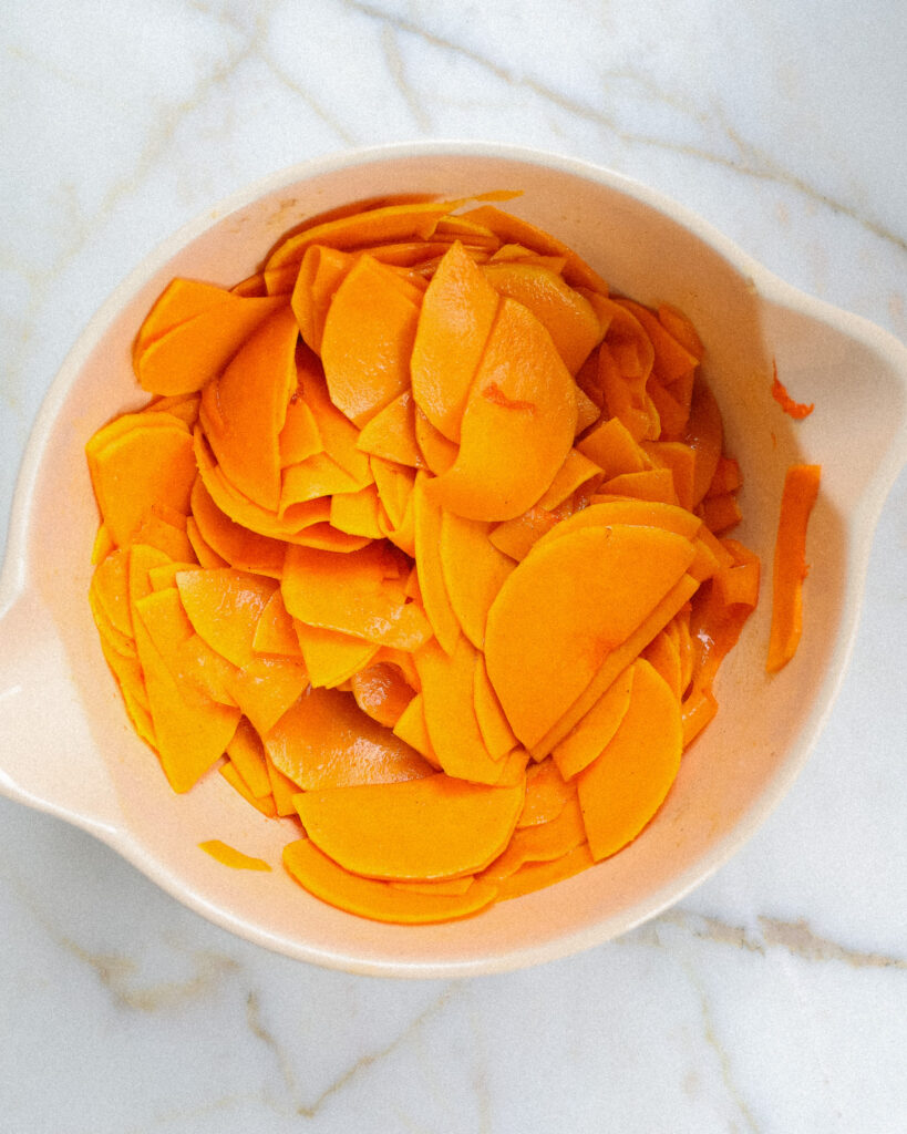 - Peel the squash and use a mandolin to slice the pieces as thinly as possible. Add these slices to a large bowl.