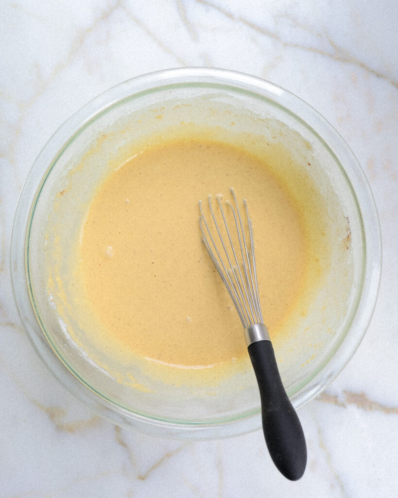 The custard that holds all this squash together is just eggs, milk, flour and some spices that make it taste like fall. Once this mixes with the sugars and the squash, it becomes a flavorful batter that holds the squash together, but bakes up the Butternut Custard Cake like magic.