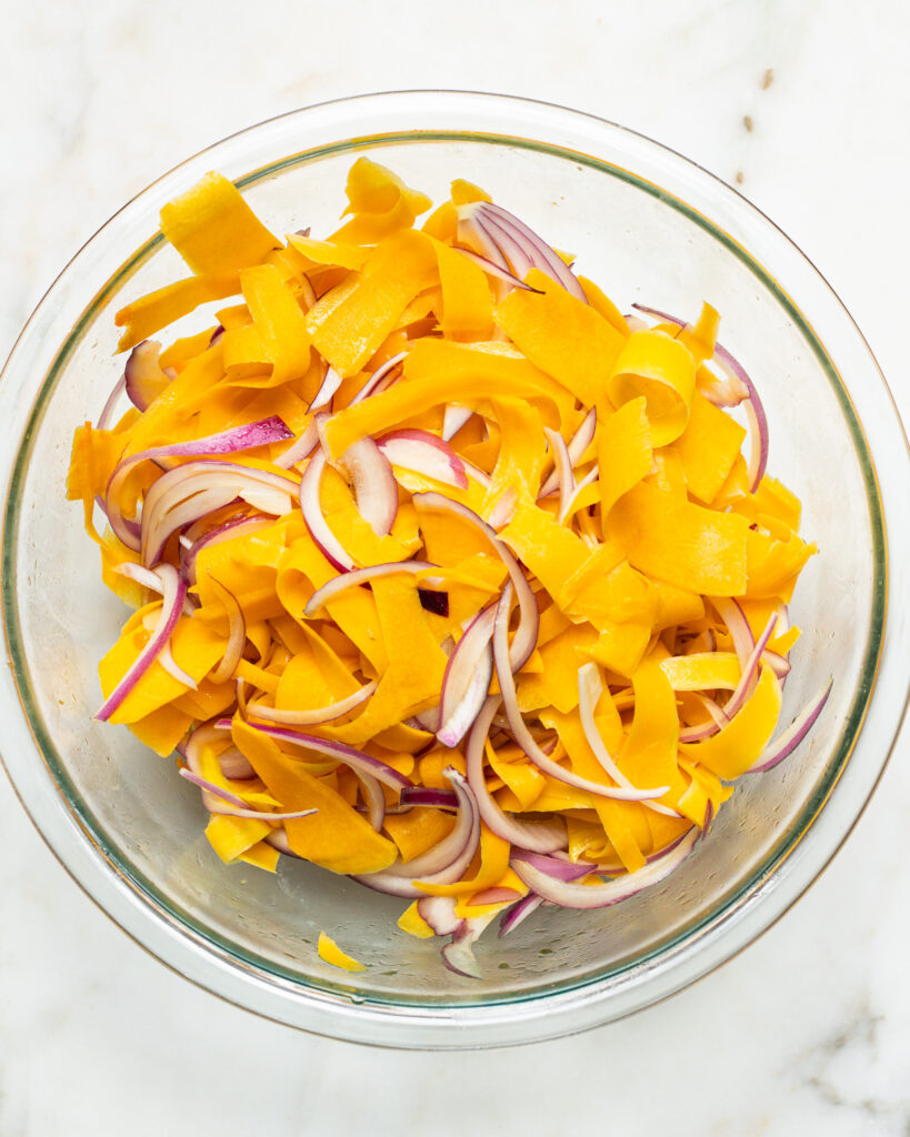 - Thinly slice half a large red onion and add it in with the squash.