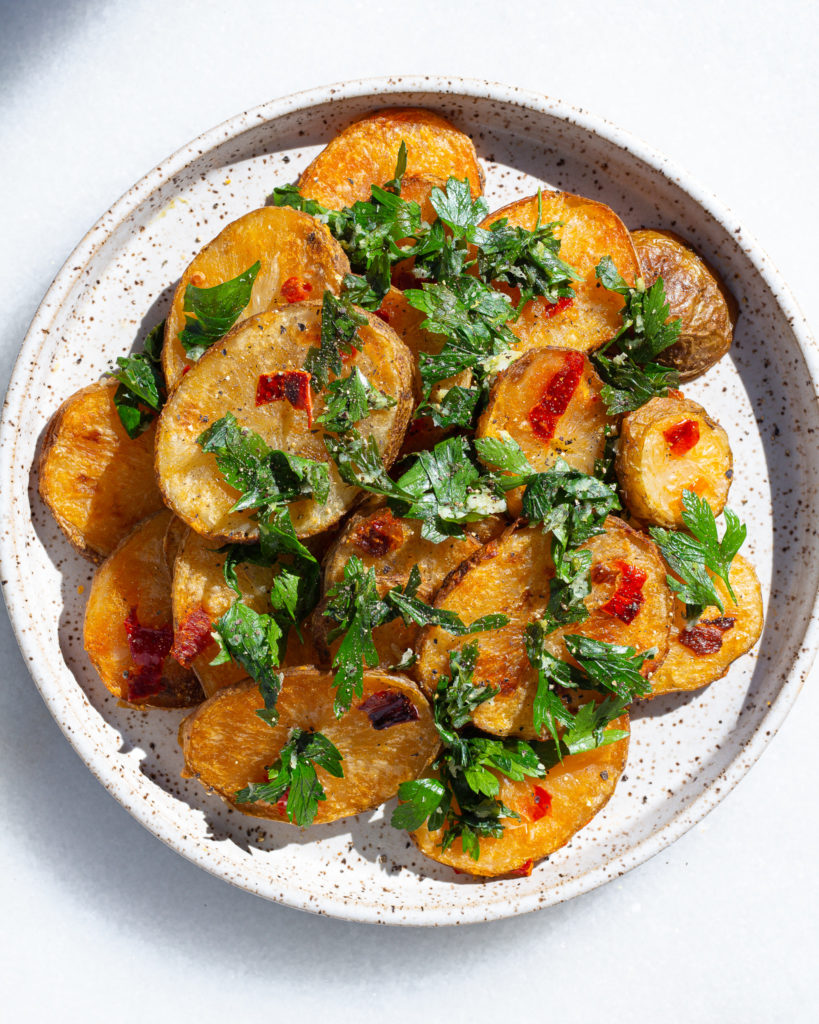 This recipe for crispy potato medallions is all about timing. Get your potatoes in the oven first, then prep the parsely lemon garnish. Here’s the details there: