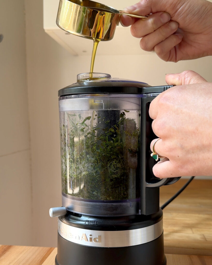 This gives your pesto the best texture, and alleviates any headaches you might have if you try to mix everything at once. Leafy greens can be stubborn, so it’s best to get them chopped up first before you start the rest of the recipe.