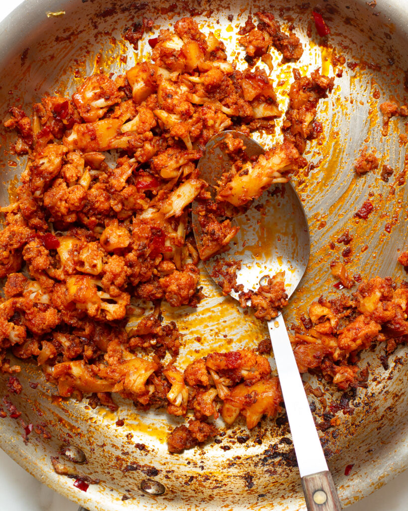 But after you’ve reached the cauliflower browning point (yay!), you can add the chilies, the garlic, cook for a few minutes and add the tomato paste. The tomato paste will need more time to cook down, about 4-5 minutes. Then add splashes of water to help it cling to the cauliflower and watch it cook down into a sticky, unctuous side dish. And in twenty minutes, you’re done!
