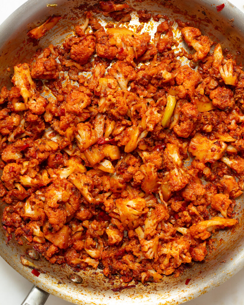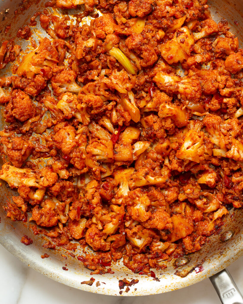 You have to cook down your cauliflower in the pan, and that takes time! Think 10-12 minutes, kind of time. But it’s worth it. You want your cauliflower browning before you add the aromatics. If you start adding them before the cauliflower gets brown, then their moisture will prevent the cauliflower from further browning, and you’ll kind of be stuck.