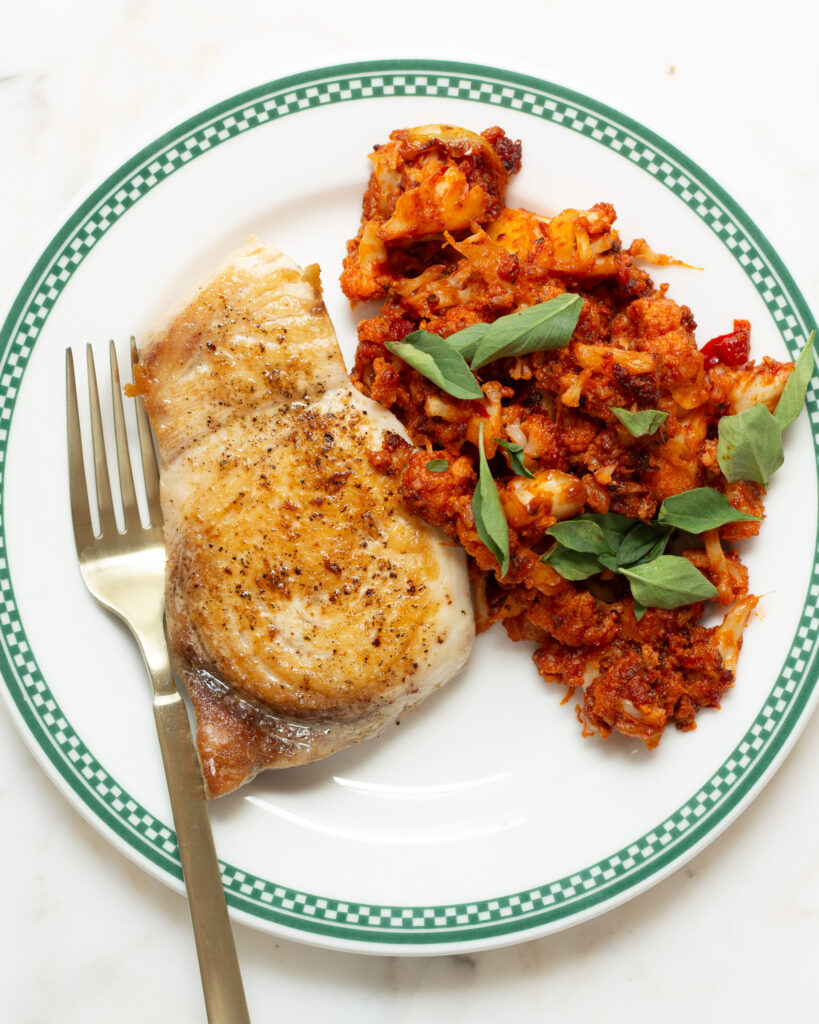 - When the cauliflower begins to deeply darken and the tomato paste starts to caramelize at the edges of the florets, then the cauliflower is ready to serve. Top with a few leaves of Italian basil, and serve alongside any protein and carb you love.