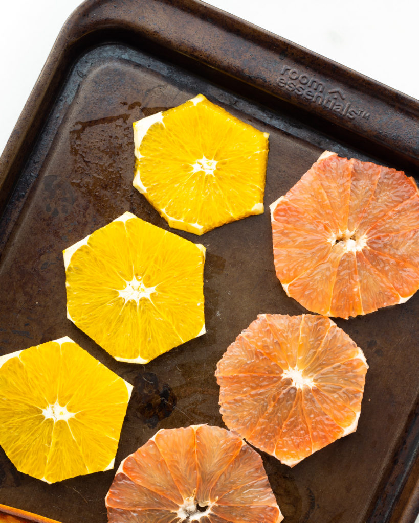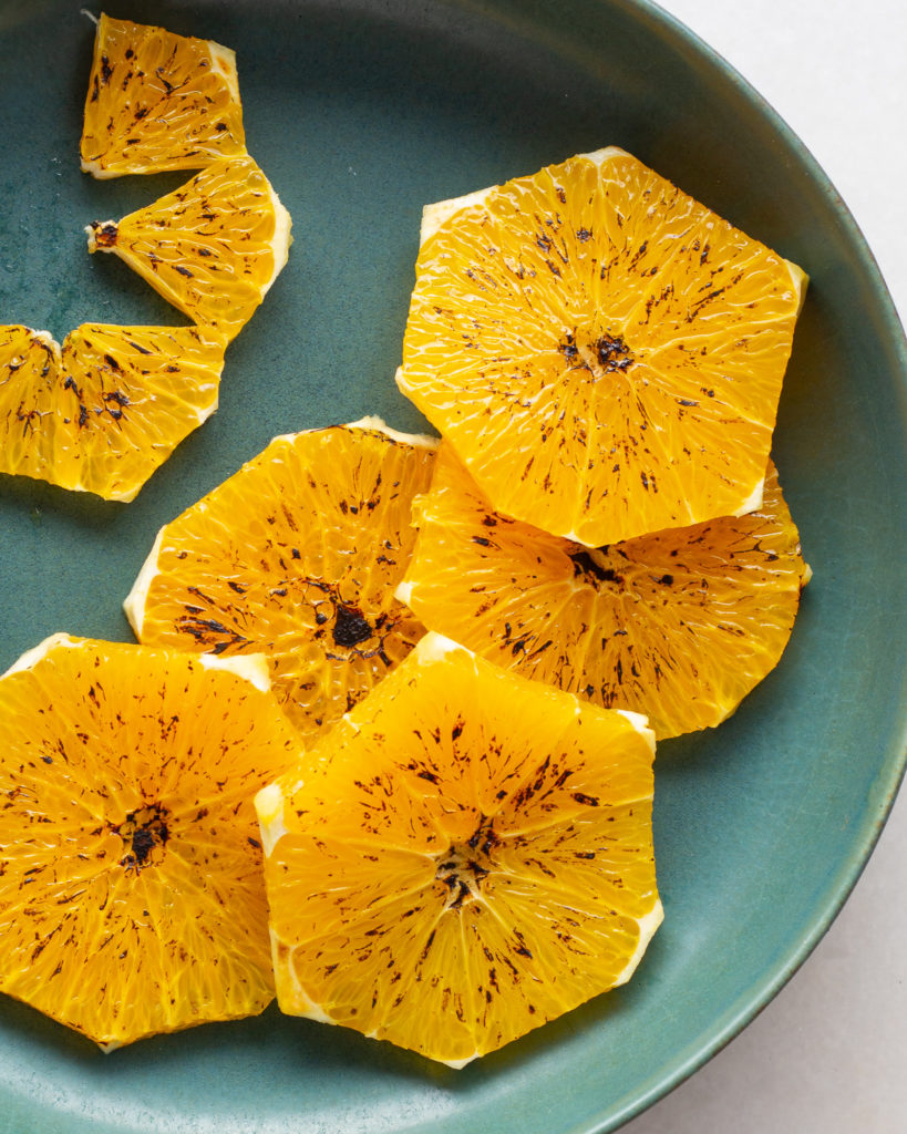 - Place the citrus slices on a baking sheet and either put under a hot broiler for 5 minutes or use a propane torch to torch each slice until charred. Let cool on the baking sheet.