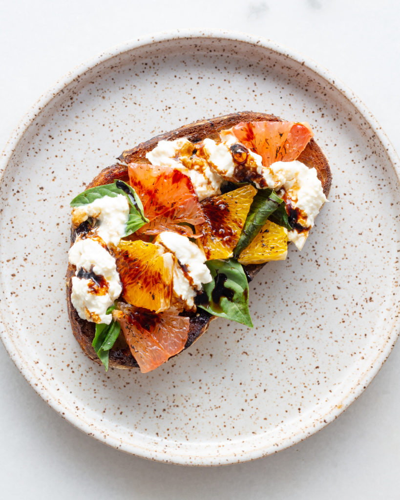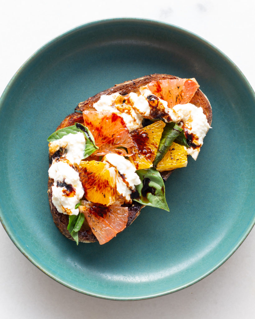 - Arrange the basil and citrus on top of the burrata on the plate. Feel free to also do this on toast or a bread of your choice!