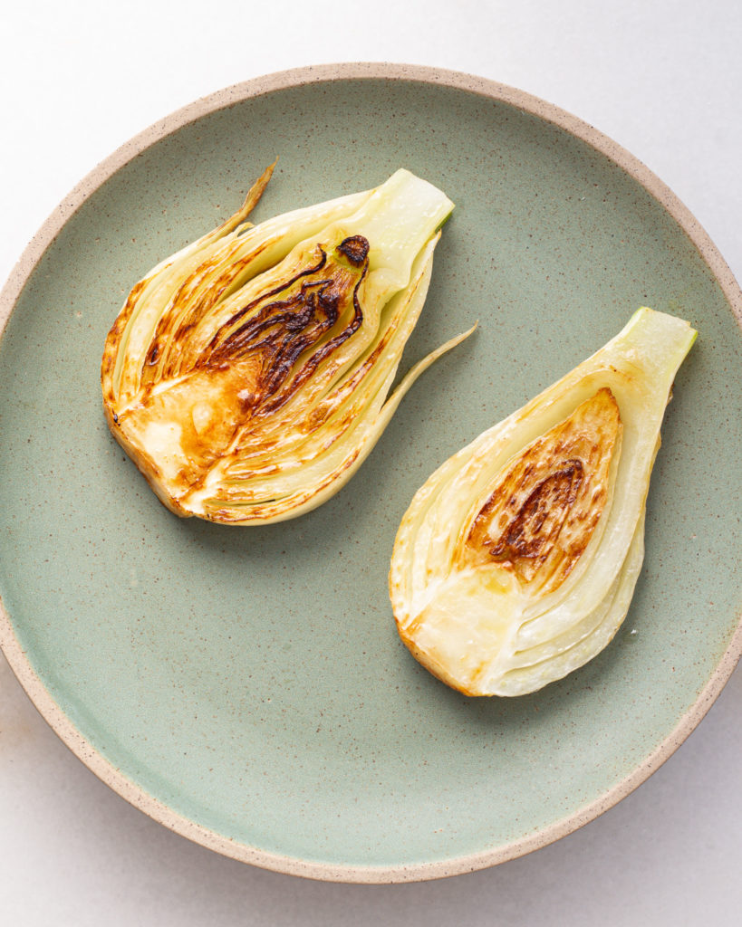 - Add about half of your olive oil to a high-sided sauté pan. Put the pan on medium heat, and add the fennel slices, cooking for 3-4 minutes on each side or until they are heavily charred. Remove them from the pan and lightly season with salt. Set them aside.