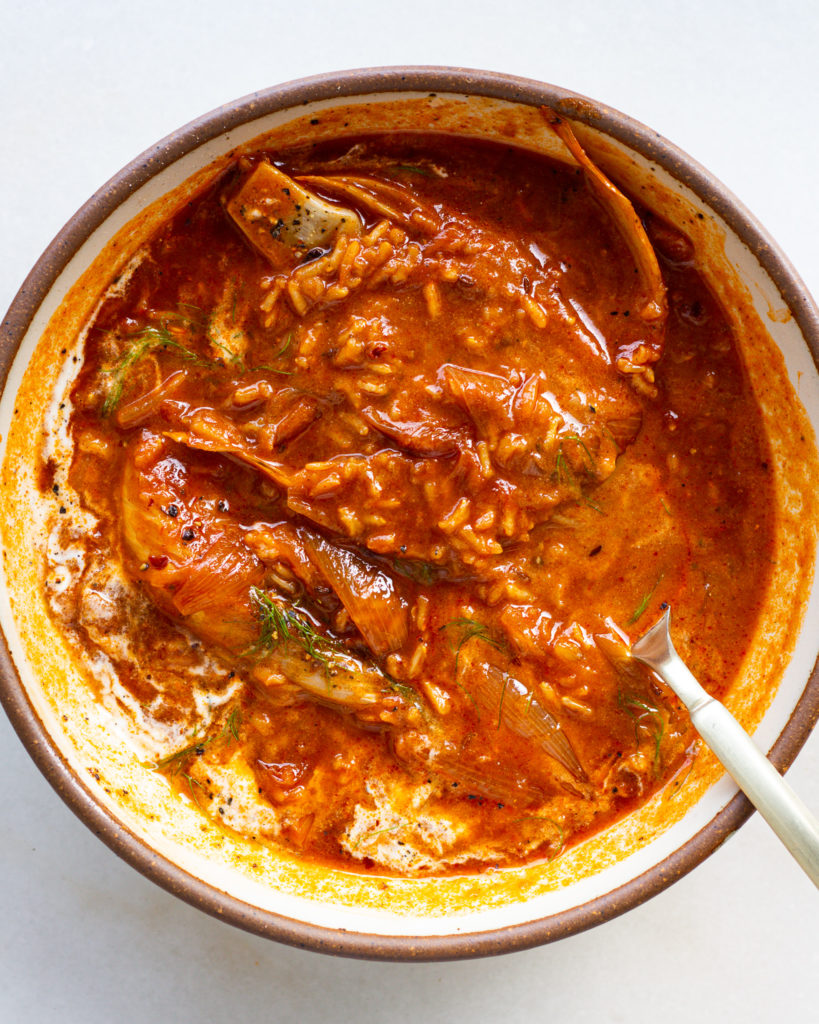 Ok BUT NOW ON TO MY SOUP – this soup is insanely simple, but all about building that flavor that every soup needs. The beauty of soups, including this charred fennel soup, is that as you cook them, their flavor builds. This soup starts with strong aromatics (hello, fennel and shallots) and builds with caraway seeds, paprika, chili flakes and of course our girl, garlic. Let it simmer for 45 minutes and watch as the flavors build this into the perfect winter soup.