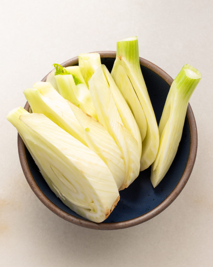 - Slice the fennel bulb lengthwise, creating 5-6 thick slices.