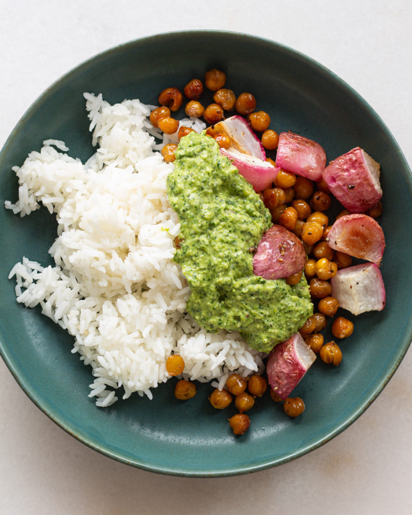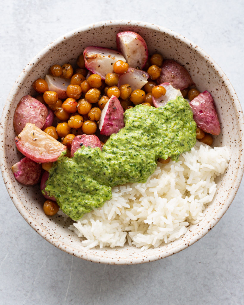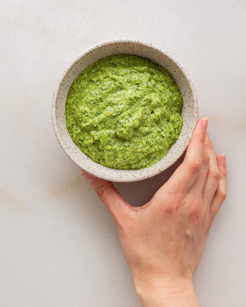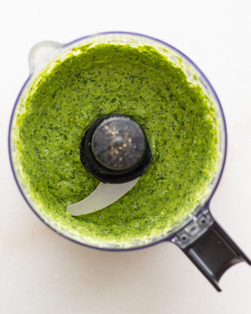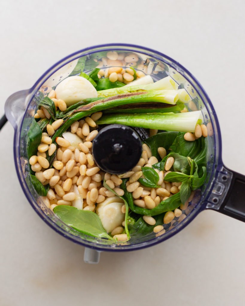 Traditional pesto is made with mortar and pestle and ground together, but sometimes…well, a lot of the time…your girl just does not have the TIME. So for this charred scallion pesto we are using our tiny food processor the way god intended – quickly, and then we are washing it immediately so we don’t forget about it in the sink.