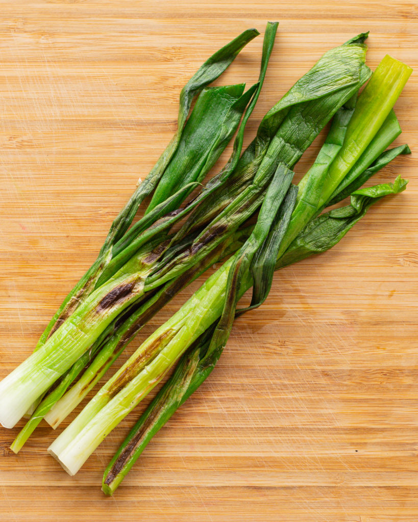 - Ventilate your kitchen, then put a cast iron skillet on medium high heat. When the skillet is hot, place the scallions on the skillet and let them char, this will take about 2 minutes. Flip and let the other side char. The darker the better.