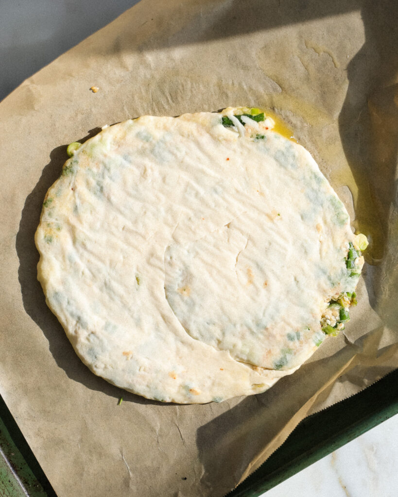 When you are layering the pancakes, layer this with grated cheese and you’ll get the perfect cheese + scallion layers.