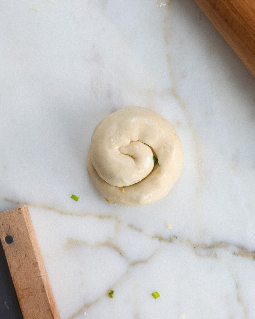 - Roll each piece of dough into roughly an 11 by 7-inch rectangle. Spread 3-4 tablespoons of the scallion mixture onto the dough. Sprinkle with 1 ounce of cheese. Roll this up the long side of the dough so that the roll is as long as possible. Then twist this log into a tight coil (see the blog post for reference).