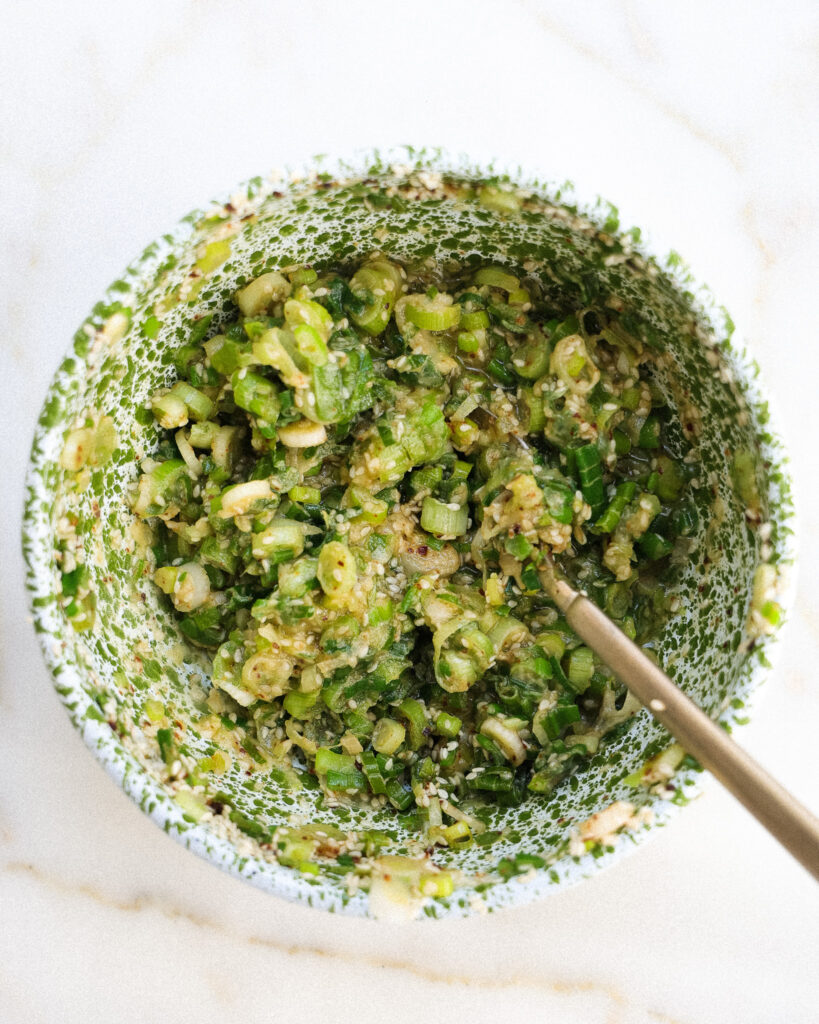 To make the filling, add the scallions, sesame seeds and gochugaru to a heat-safe bowl. Put the canola oil over heat until it’s smoky and slightly wispy. Immediately pour it over the scallion mixture and stir. Add the flour and mix again.