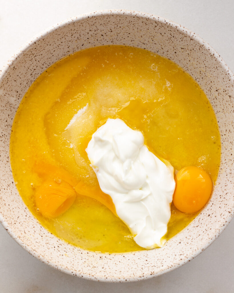 - In a large bowl, beat together 2 eggs, 113 grams of butter, 220 grams of granulated sugar, 85 grams of skyr, and 1 teaspoon of vanilla until very smooth.