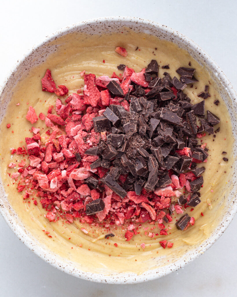 - In batches, add the dry ingredients to the wet, alternating with splashes of 1/3 cup of milk. Mix until a smooth batter forms. Fold in 35 grams of chopped freeze-dried strawberries and 70 grams of chopped chocolate to combine.