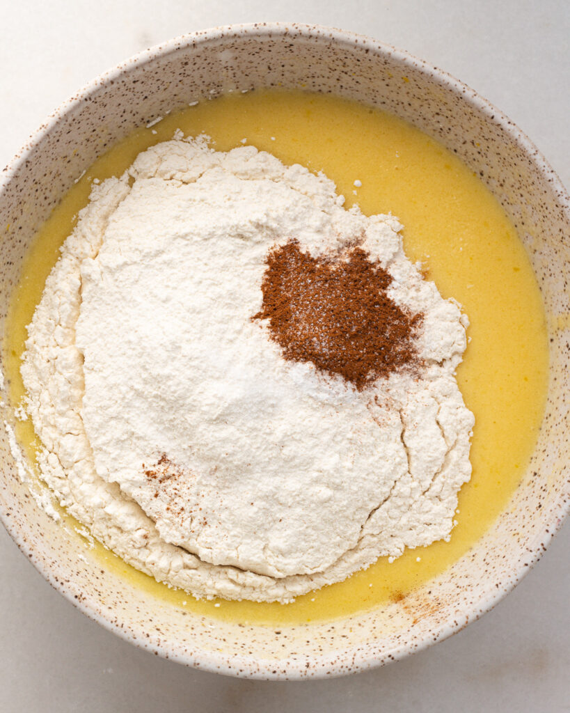 - In a medium bowl, whisk together 280 grams of all-purpose flour, 2 teaspoons of baking powder, 1 teaspoon of kosher salt and 1 teaspoon of cinnamon.