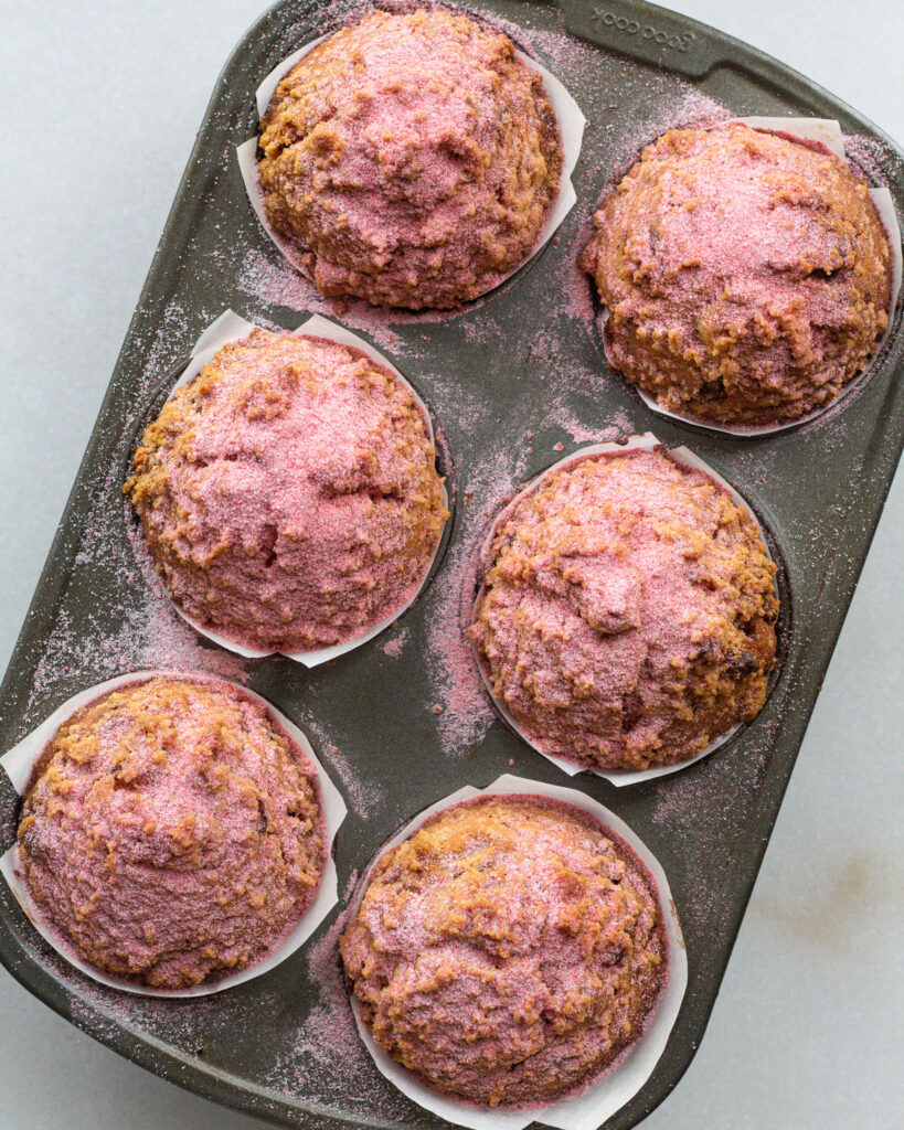 These muffins add themselves to my muffin family, meaning that they are super easy, usually only need a bowl or two, and yes, this time we succumbed to a crumble. But after a dusting of adorable strawberry sugar on top of the crumble, it’s totally justified.