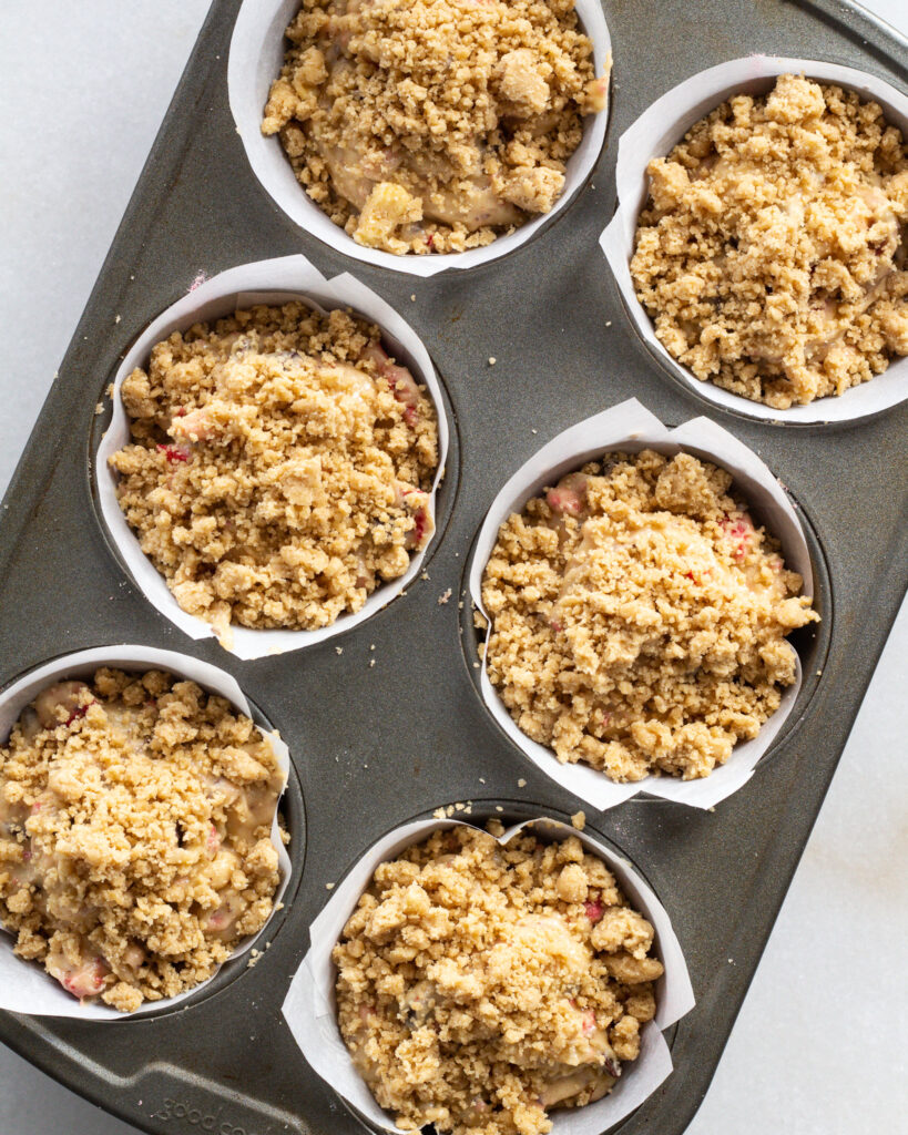Sprinkle the crumble topping generously on top of each muffin. Bake at 375°F for 30-35 minutes.