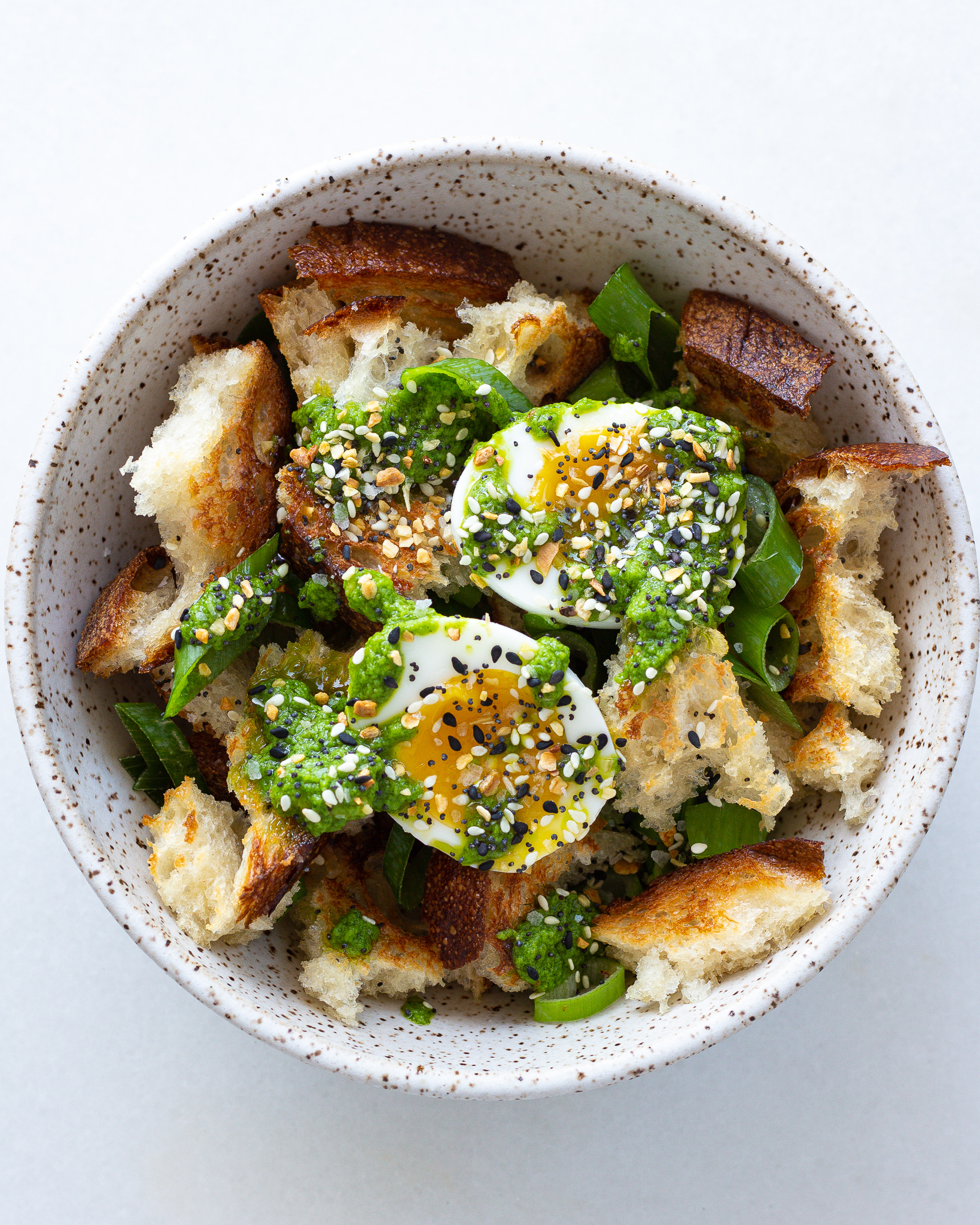While the key components of this dish are all present, a few important differences are at work in this çilbir verde when compared with the traditional recipe. My version swaps the soft, poached egg for a crispy-edged, fried version, and replaces the red chili oil for a chunkier green sauce. Paired with a crusty slice of bread, this dish ticks so many flavor and texture boxes, serving you crispy, crunchy, creamy, spicy, and herbaceous.