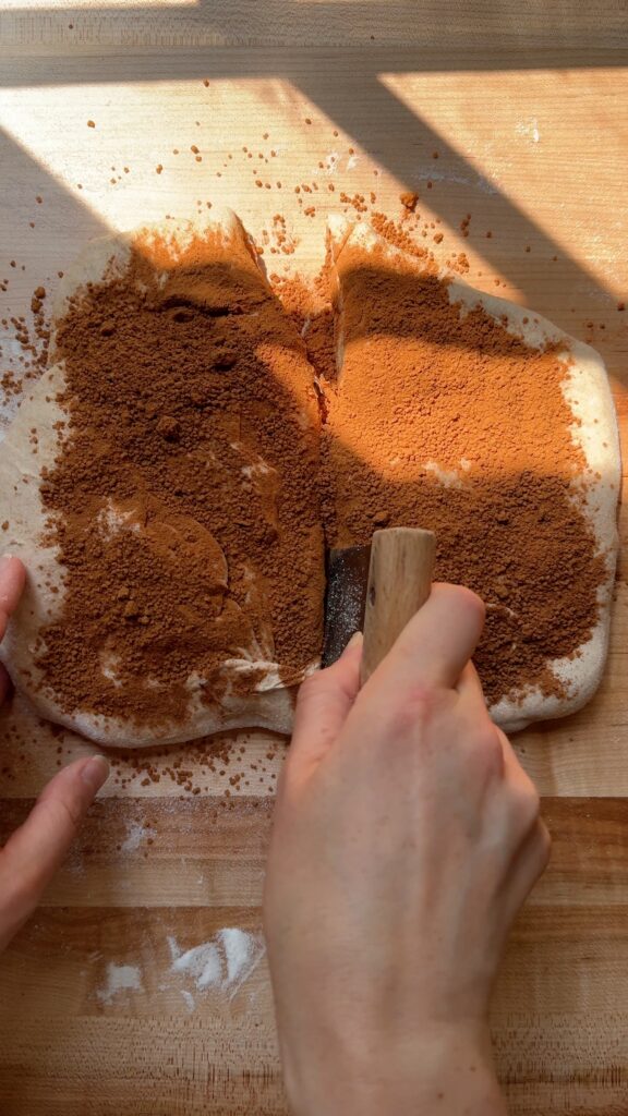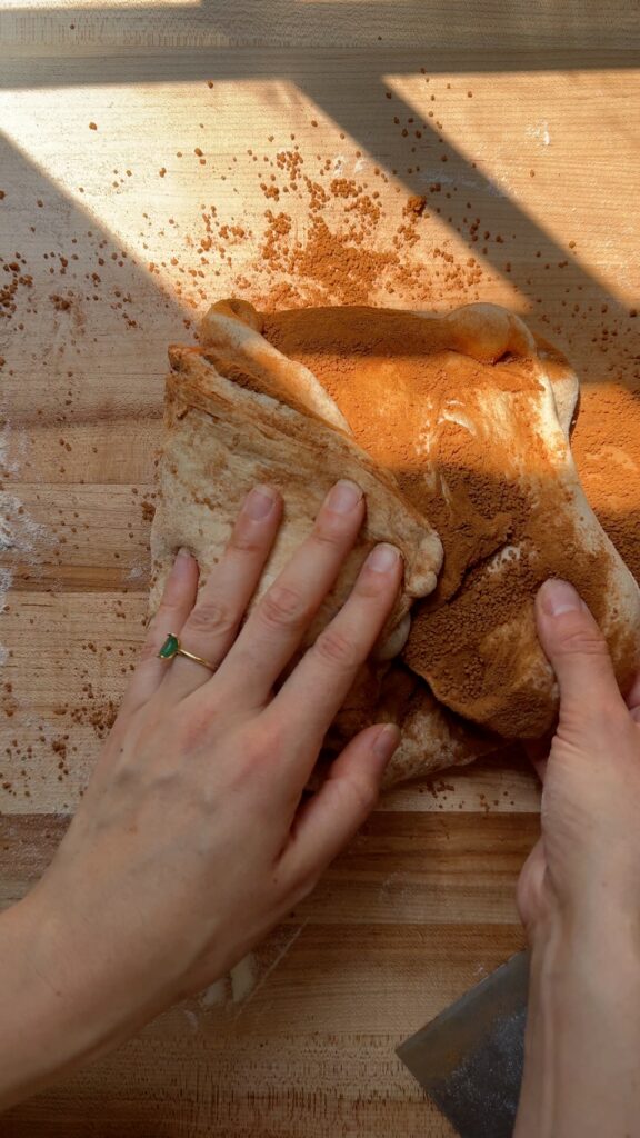 Flip the dough back over so that the seam side is facing up. Stretch out the dough into as large of a rectangle as you can. Dust the entire top of the dough with the cinnamon sugar mixture. Use a bench scraper to slice down the center of the rectangle. Take one piece, carefully lift it up and place it on top of the other piece, making sure that the cinnamon sugar filling on both pieces is facing up.