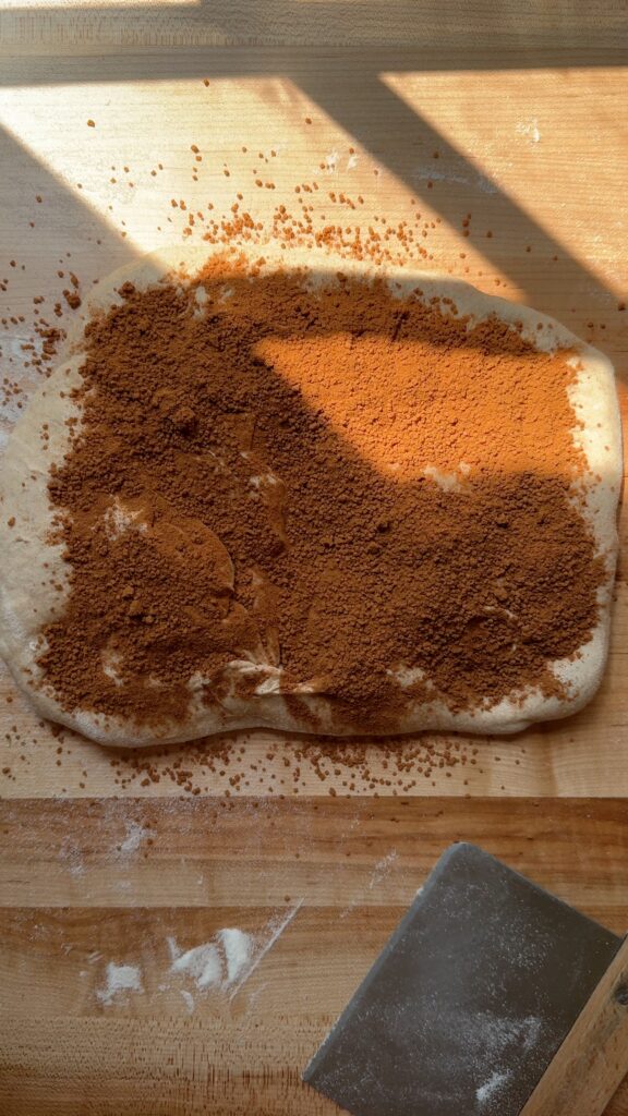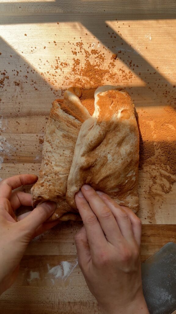 - Step 7 – Shape the dough. Flip the dough back over so that the seam side is facing up. Stretch out the dough into as large of a rectangle as you can. Dust the entire top of the dough with the cinnamon sugar mixture. Use a bench scraper to slice down the center of the rectangle. Take one piece, carefully lift it up and place it on top of the other piece, making sure that the cinnamon sugar filling on both pieces is facing up.