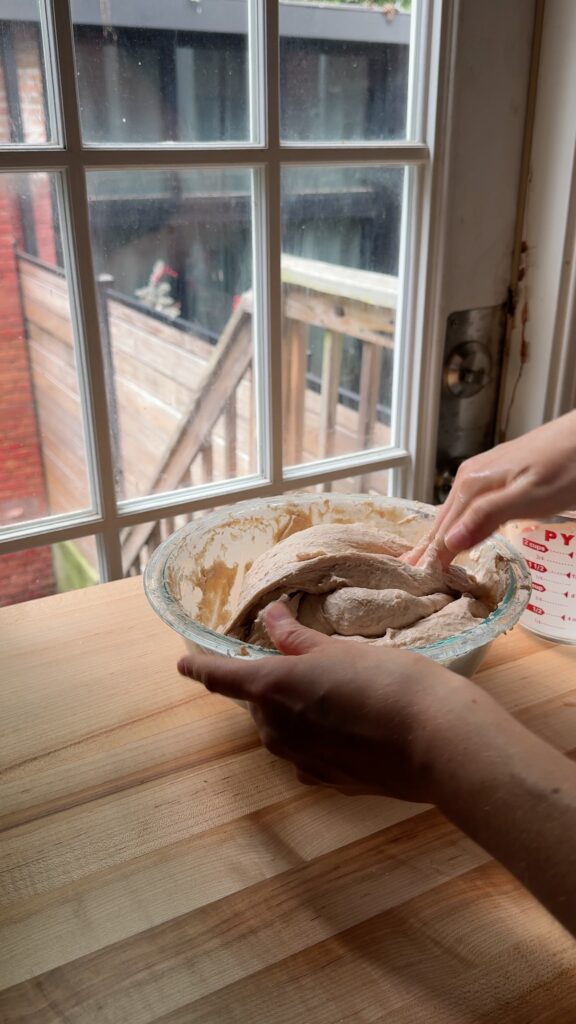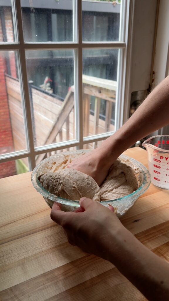 I do this either in the bowl I mixed the dough in or on a clean surface. Use damp hands to lift up the dough completely out of the bowl, letting the sides hang down. Fold the dough onto itself in what we call a “slap and fold.” The slap can be gentle, you are just letting the edges of the dough cling to the bowl and setting it down, thus tightening the loaf. Rotate the bowl 45 degrees, lift the dough again, and “slap” it down again. Repeat this until the dough has formed a nice, tight mound. Cover with a damp cloth, wait 30 minutes and repeat the process. Repeat the process three times.