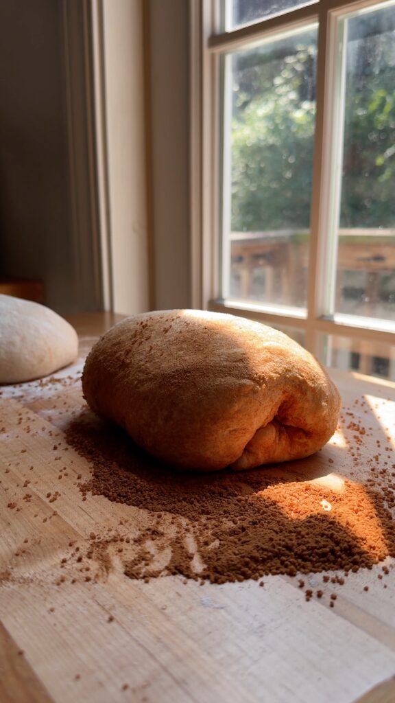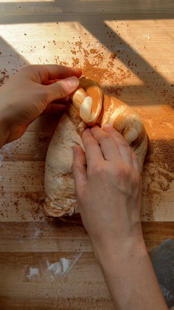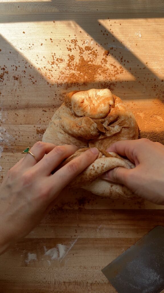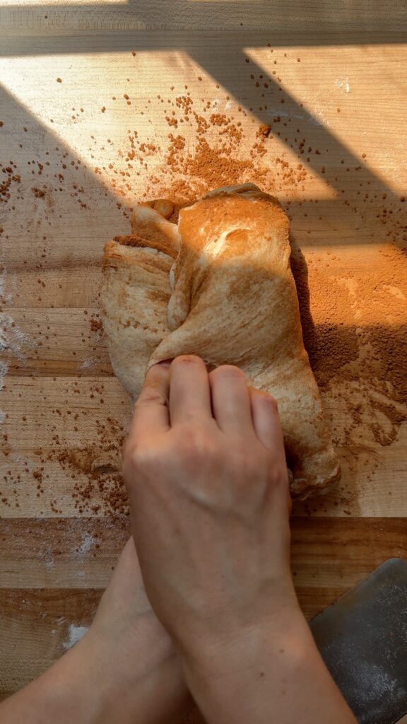 Stretch out the two dough pieces into a rectangle again. Fold one side of the dough one third of the way over, as if closing a book. Fold the other side over to make the dough into a package. Use your fingers to “pinch” together the dough on the shortest side of the package. Then, repeat this in the center of the dough and once more at the other shortest side of the dough. Roll up the dough, carefully encapsulating all the cinnamon sugar inside. Pull the seam of the dough taut by gently pulling the dough ball towards you and letting the seam grip the surface of the counter.
