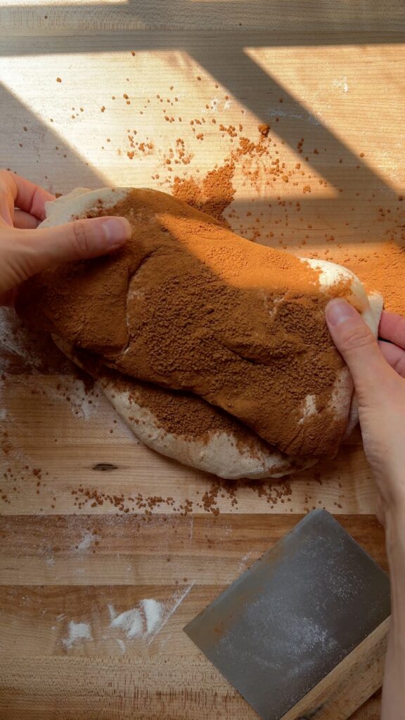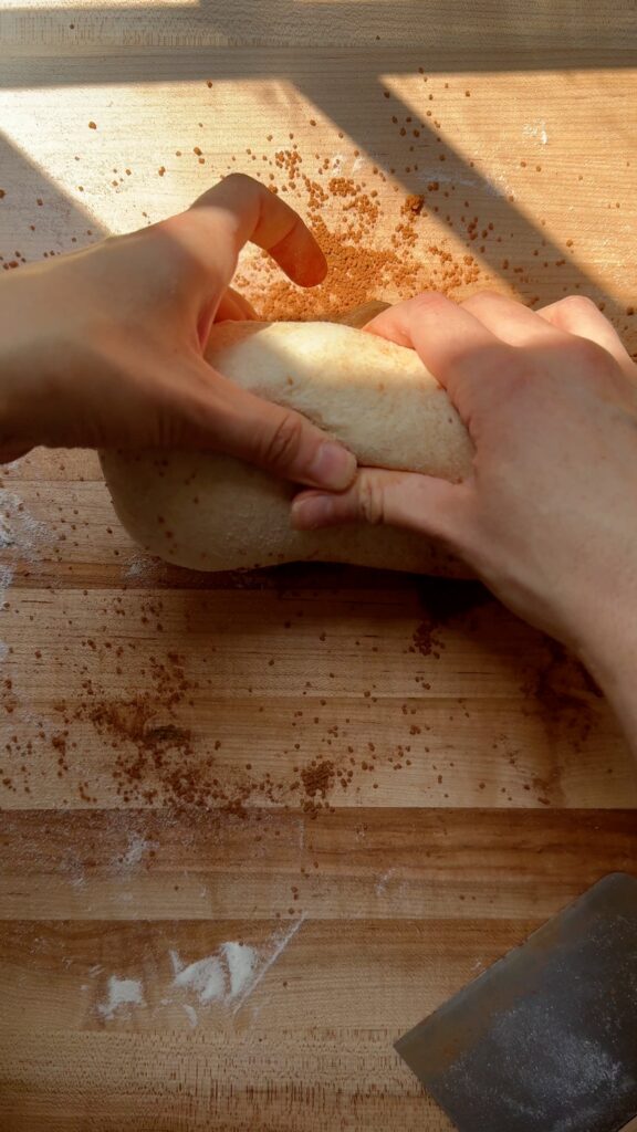When the dough has risen, lightly flour a surface with all-purpose flour and pour out the dough. Grab an edge of the dough and pull it to the center. Rotate the dough and repeat, folding it into an upside-down ball. Flip the dough over so that the seam is on the counter. This is called “pre-shaping.” Let it sit for 20 minutes while you mix the cinnamon sugar together.