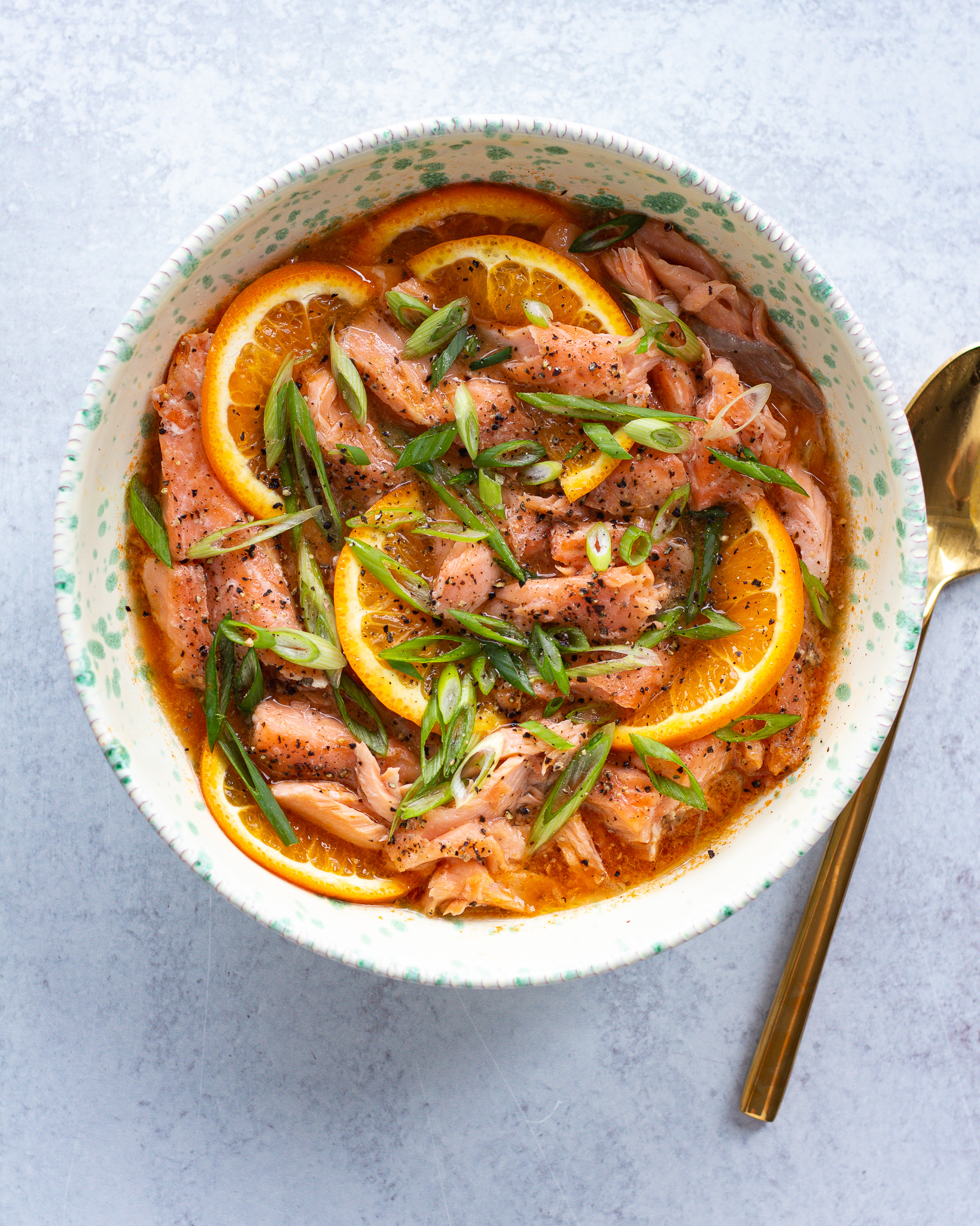 It uses a “reverse marinade” method where you cook the salmon first, and then add it to the citrusy broth after. Then just scoop and serve or eat straight from the bowl. It’s amazing with rice, quinoa, noodles, any grain or starch. And it can be adapted just for one or to feed a crowd.