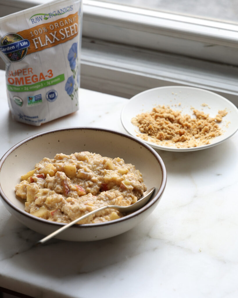 - While the oats are cooking, to a small bowl add the 1/4 cup of flax meal, 1 teaspoon of honey, 1 teaspoon of cool water and 1/8 teaspoon kosher salt. Mix with your fingers until it turns into a crumbly, cobbler-topping-like texture. Taste and add more salt as you prefer.