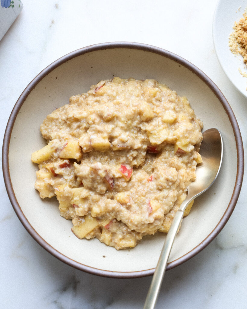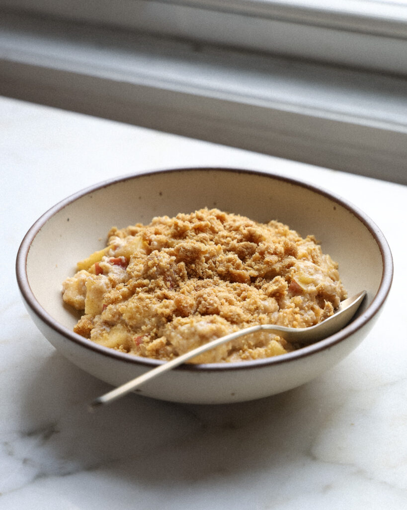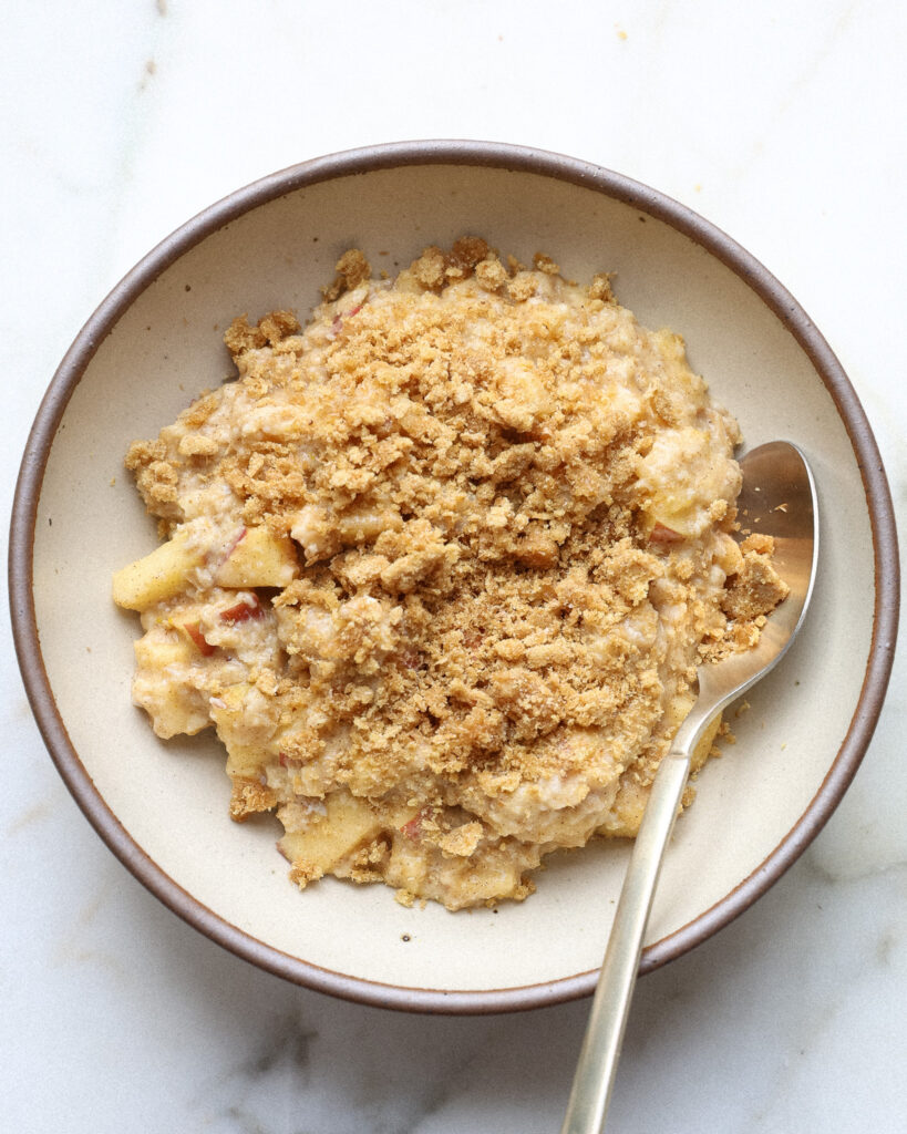 Sprinkle the cobbler topping evenly over the oats. Drizzle some milk on the edge of the bowl for serving, if that’s your thing. Eat immediately!