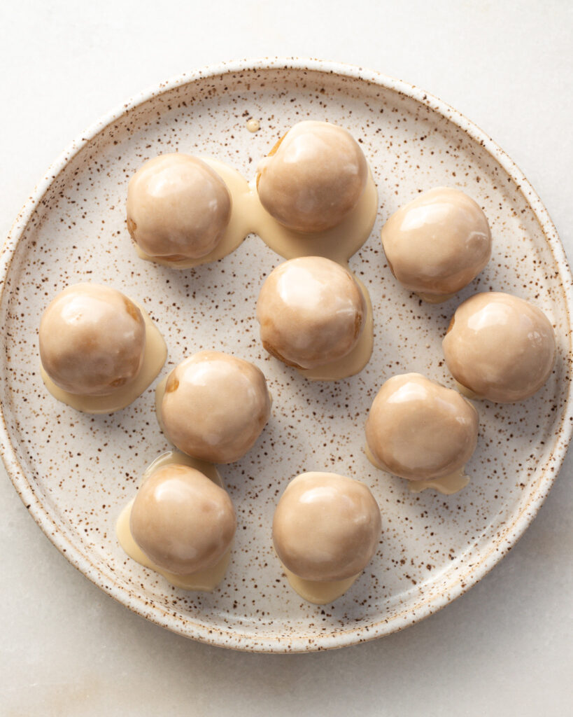 - Roll the dough into 10 equal sized balls, about 1″ in diameter each. Dip the tops of each ball in the glaze and place the undipped part down on a plate, letting the glaze drip down and cover the sides.